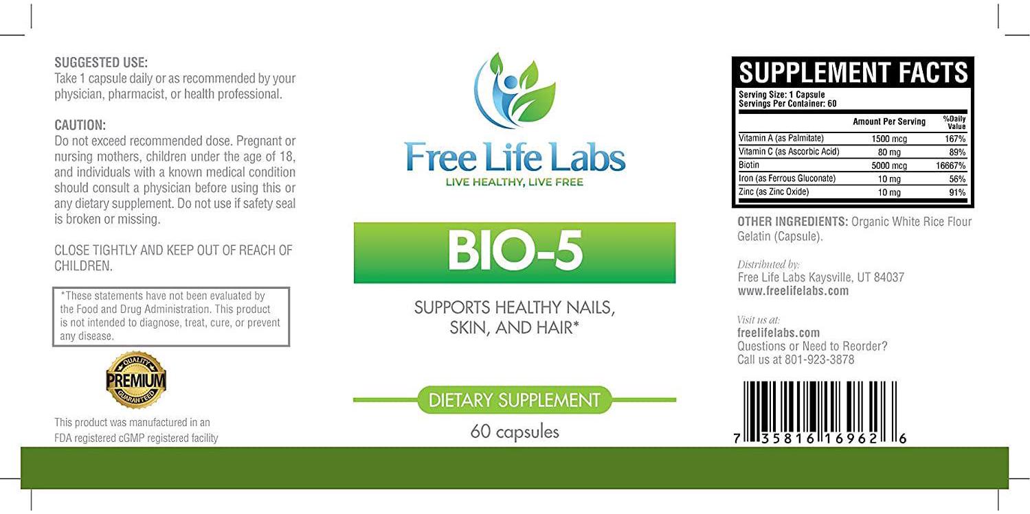 Bio-5 Nail, Skin, and Hair Supplement - 5000mcg Biotin, Zinc, Iron, Vitamin C, Vitamin A - 60 Day Supply