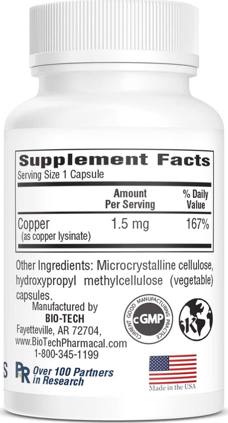 100 vegcaps, bio-tech cu 1.5, bioavailable copper, cardiovascular health, nervous system health, tissue maintenance