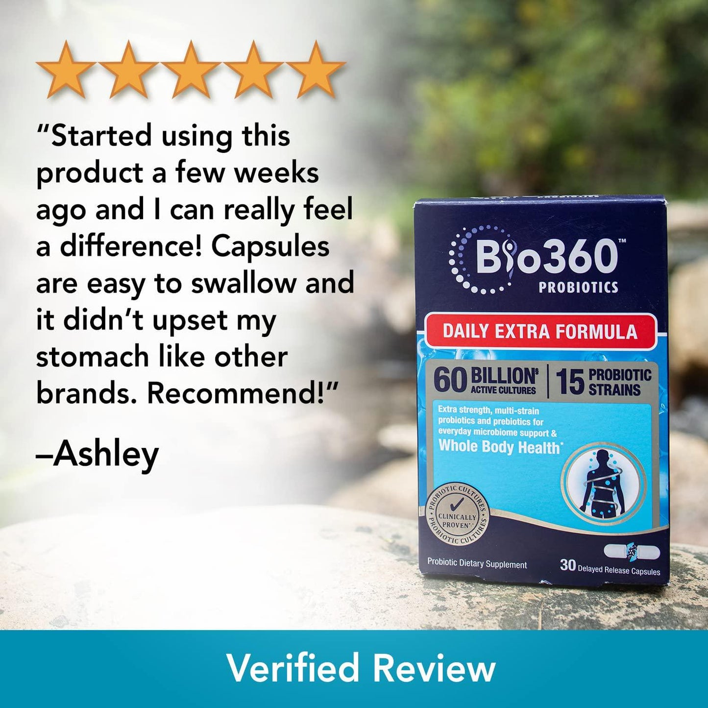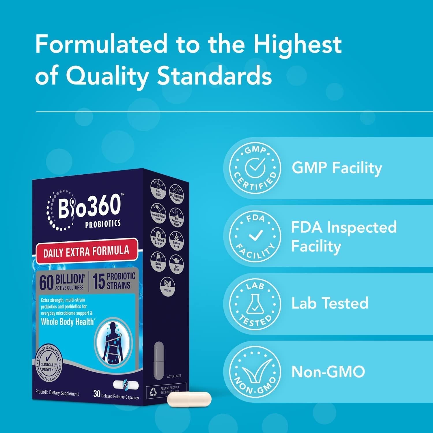 Bio360 Probiotic Daily Extra Formula | Vegan Prebiotics and Probiotics for Women and Men | 60 Billion CFU 15 Strain | Stable Blister Pack | 30 Supplements