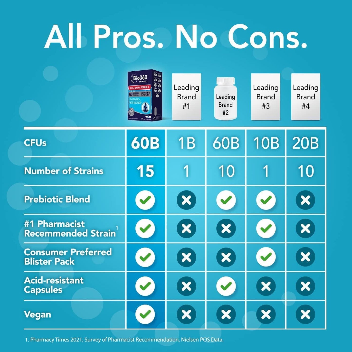 - INTEGRATED GUT HEALTH SUPPORT: Bio360's probiotics are grounded in science, backed by over 700 research studies and manufactured in a FDA-inspected facility (GMP certified). Our vegan probiotics contains the well known lactobacillius acidophilus bacteria.
