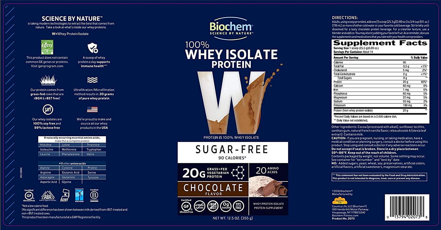 Biochem 100% Whey Isolate Protein - 12.5 oz - Sugar Free Chocolate - Keto-Friendly - 20g Vegetarian Protein - Amino Acids - Iron - Magnesium - Cocoa - Invigorating Taste