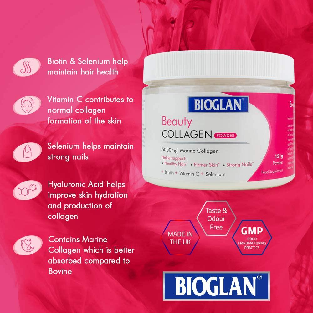 - UNIQUE FORMULATION: Bioglan Beauty Collagen powder is a high strength Collagen supplement, specially formulated with readily absorbed hydrolyzed Marine Collagen and Hyaluronic Acid to help support the maintenance of healthy looking hair, skin & nails.