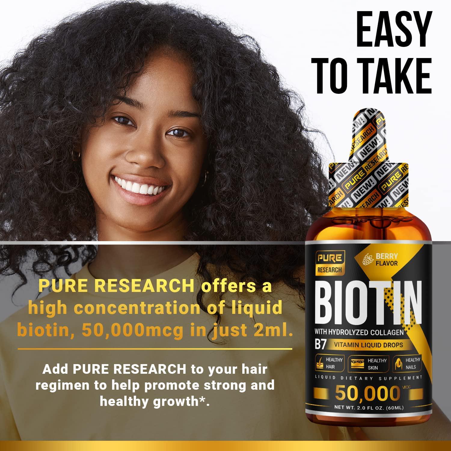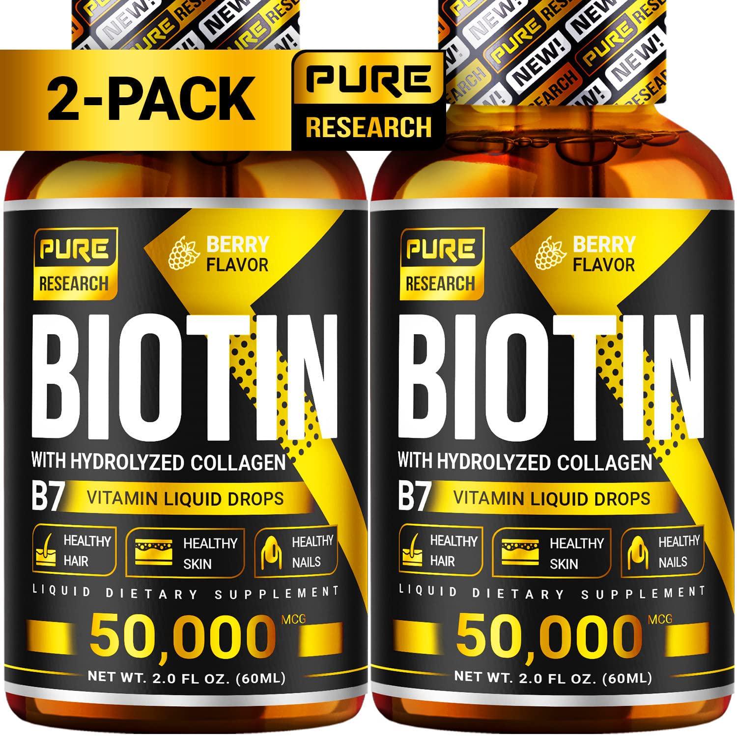 - High Potency Support For Hair, Skin, & Nails - Pure Research liquid Biotin and Collagen contains a high potency of biotin and collagen to support hair growth, healthy skin, and strong nails. Each serving of just 1mL contains 25,000 mcgs. That is 10,000 mcg of biotin (also known as Vitamin B-7) and 15,000 mcg of porcine hydrolyzed Collagen type I & III.