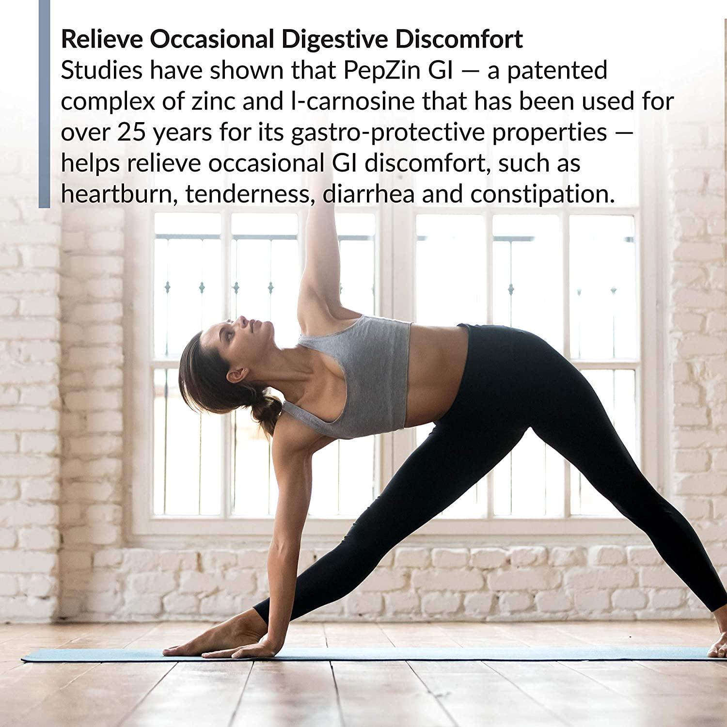- RELIEVE OCCASIONAL DIGESTIVE DISCOMFORT: Studies have shown that PepZin GI -- a patented complex of zinc and l-carnosine that has been used for over 25 years for its gastro-protective properties -- helps relieve occasional GI discomfort, such as heartburn, tenderness, diarrhea and constipation.
