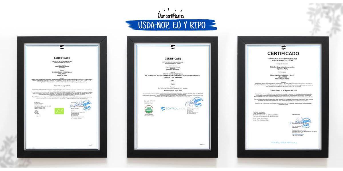 - ? CERTIFIED PRODUCTS.- USDA NOP and EU organic certified by Control union. We worked to adapt our products to be consumed worldwide.Therefore, we challenge ourselves and manage to obtain new certifications.