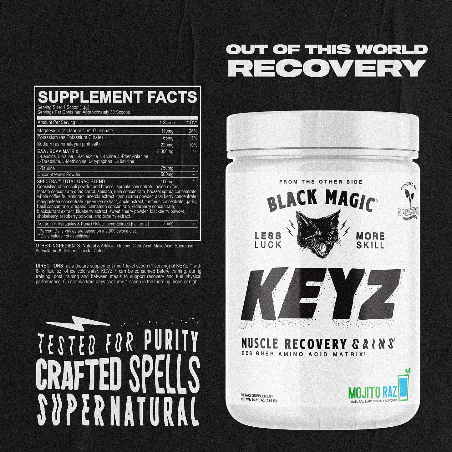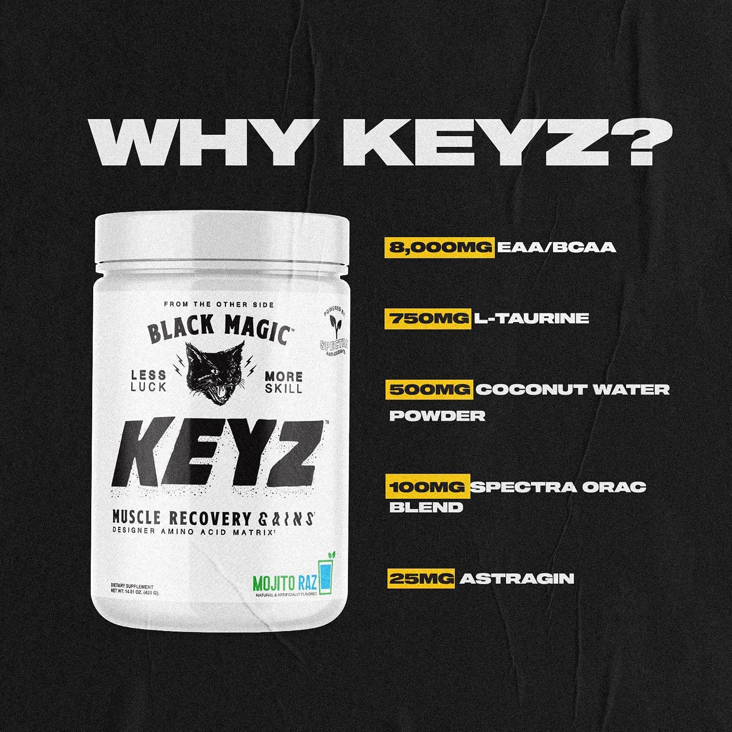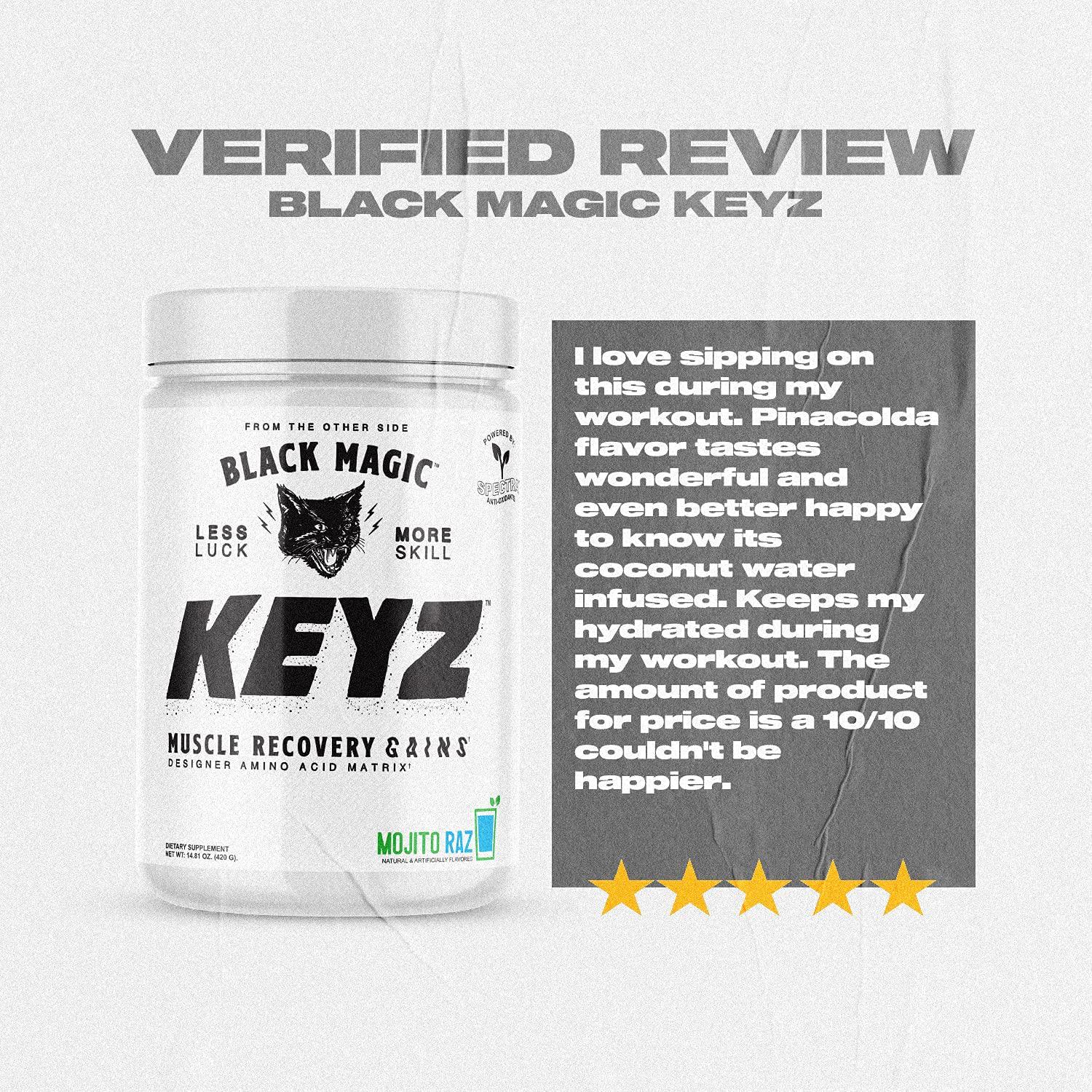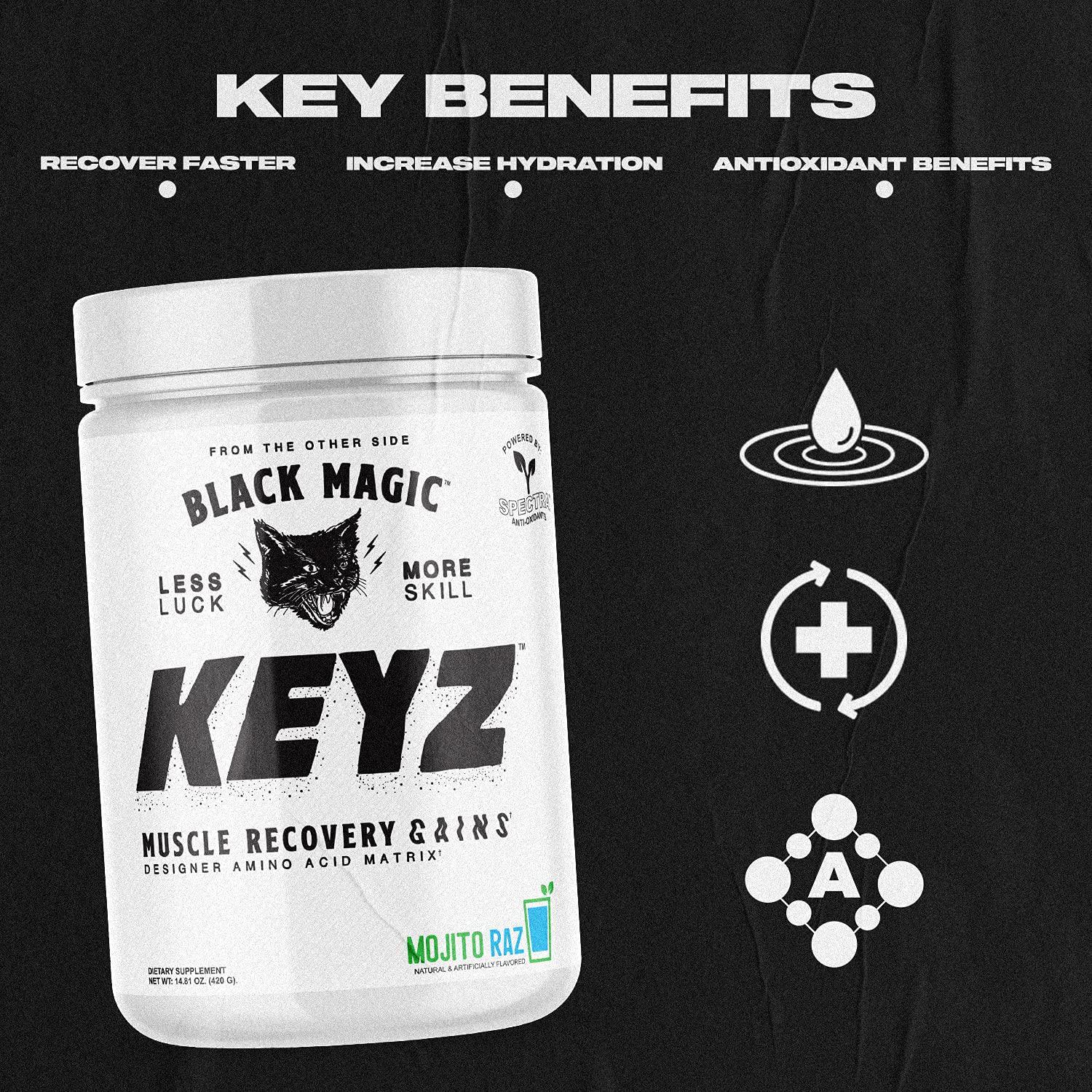 - IMPROVED RECOVERY- Black Magic Supply Designer Amino Acids KEYZ assists in rapid muscle repair.