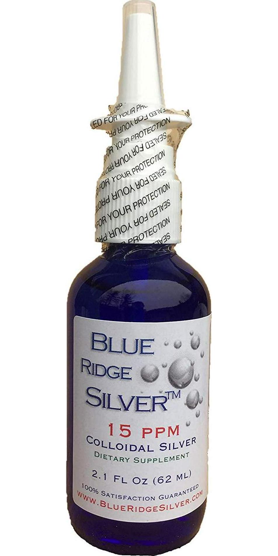 This 2.1 ounce Vertical Spray bottle of 15 ppm Blue Ridge Silver offers a convenient pocket-sized package of this amazingly effective colloidal silver product. Each recommended serving of 20 sprays of this 15 ppm Blue Ridge Silver provides approximately 45 micro-grams of pure nano-silver. This product is perfectly safe when used as directed. All Natural - No Additives or Preservatives.