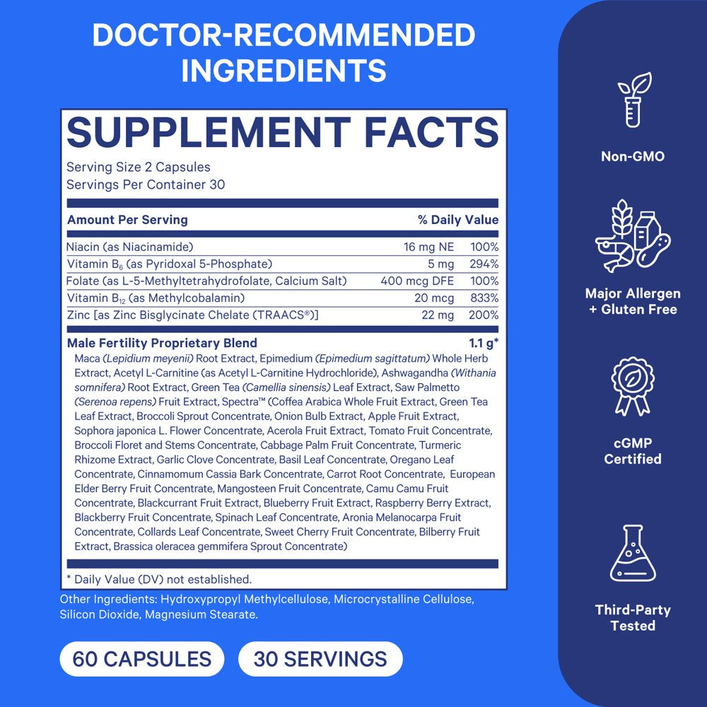 - Includes Zinc, Vitamin B12, L-Carnitine, Maca Root, and Horny Goat Weed for male fertility