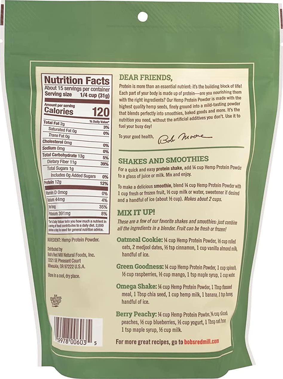 Bob's Red Mill Hemp Protein Powder dissolves easily and has a mild taste, making it a wonderful addition to your smoothie or shake. It can also be added to baked goods, pancakes and hot cereals for a boost of protein, fiber and iron.
