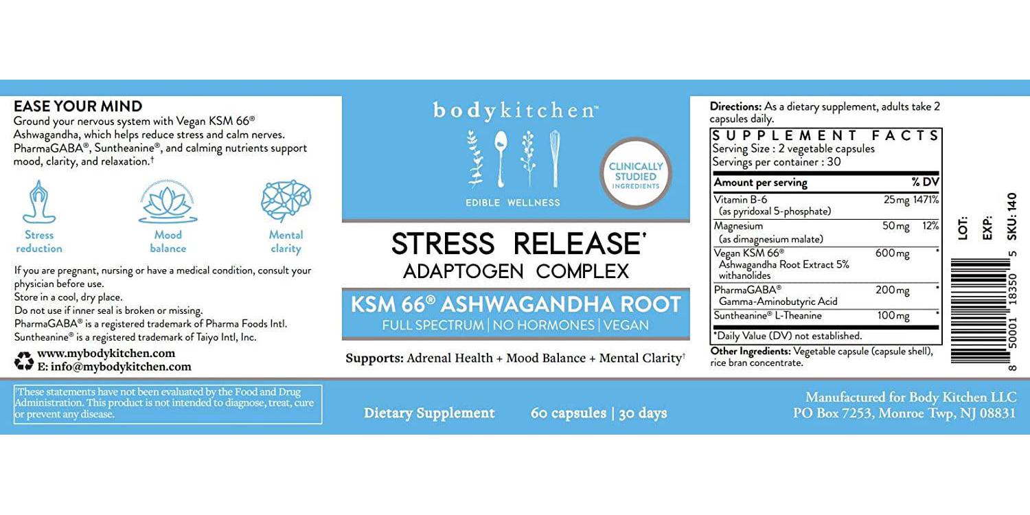 Body Kitchen - Stress Release, Daily Stress, Mood, Sleep Supplement, KSM 66, PharmaGABA, Suntheanine L-Theanine, Vitamin B-6, Magnesium, Vegan, Veggie Caps, 60 Count