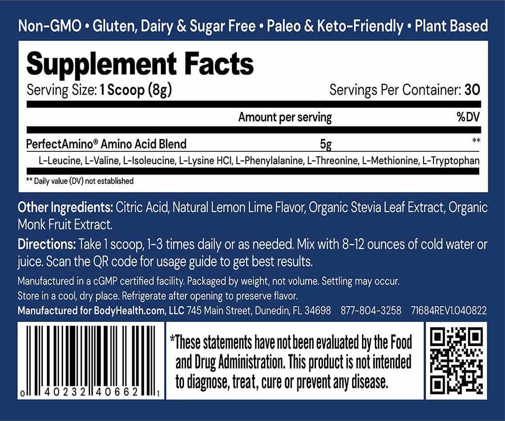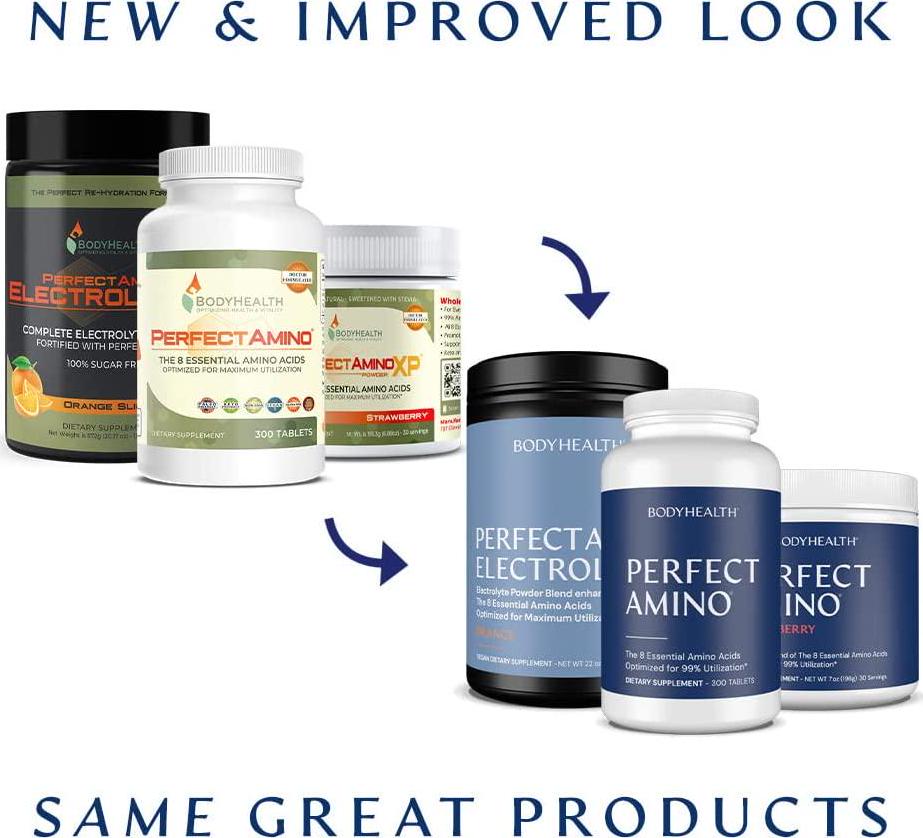 - NEW LOOK, SAME GREAT PRODUCT. You may receive either product packaging during this transition. FORMULATED WITH 8 ESSENTIAL AMINO ACIDS: We included ALL 8 essential amino acids in our specially formulated PerfectAmino XP for 99% bio-availability. Your body gets maximum utilization, including BCAAs to ensure optimum nutrition & recovery.