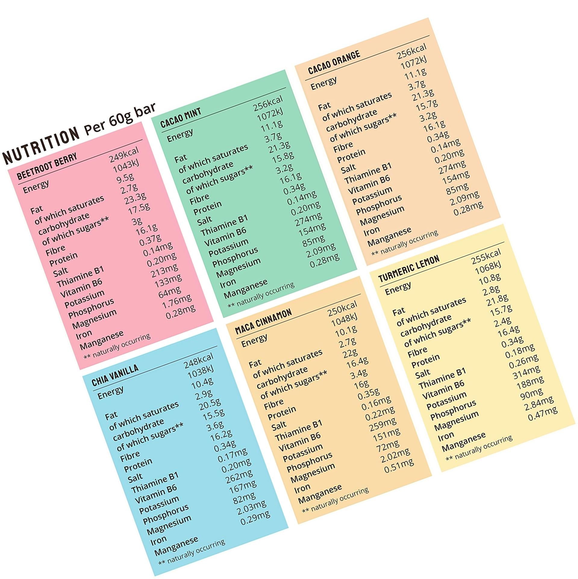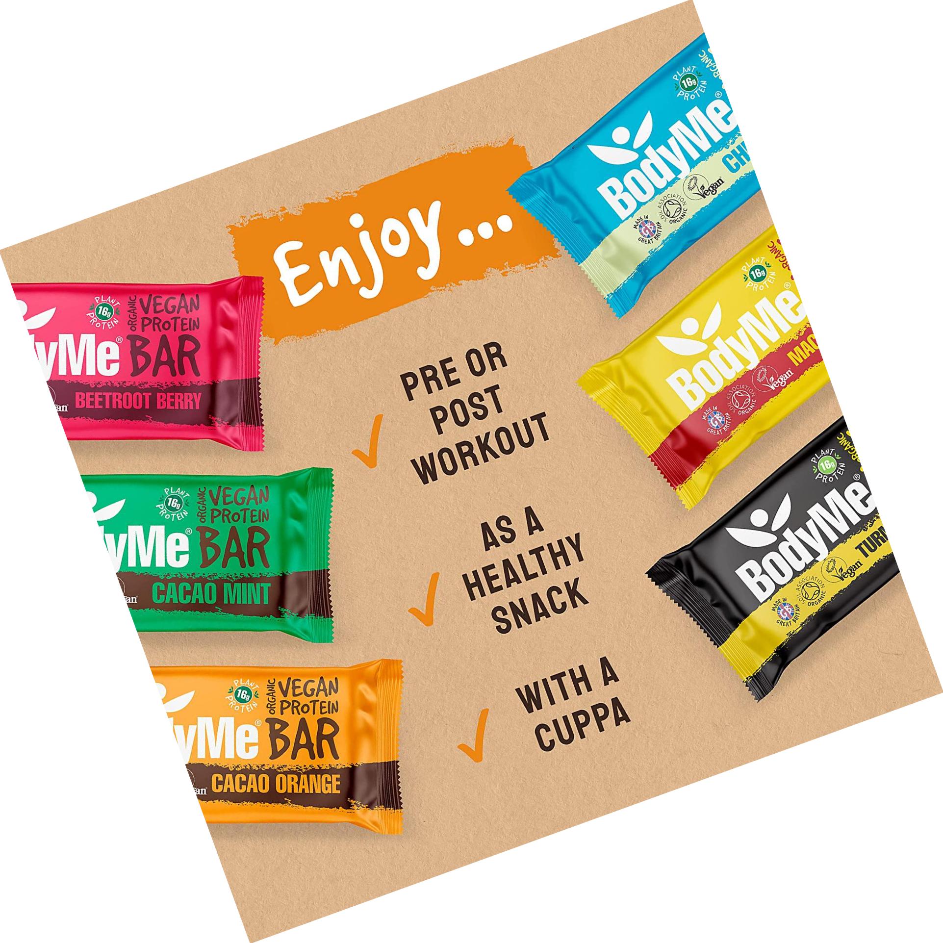 - CERTIFIED ORGANIC INGREDIENTS. Every bar contains the finest real food certified organic ingredients. Mixed box of 12 BodyMe Bars including Cacao Orange x 2, Cacao Mint x 2, Chia Vanilla x 2, Turmeric Lemon x 2, Maca Cinnamon x 2 and Beetroot Berry x 2.