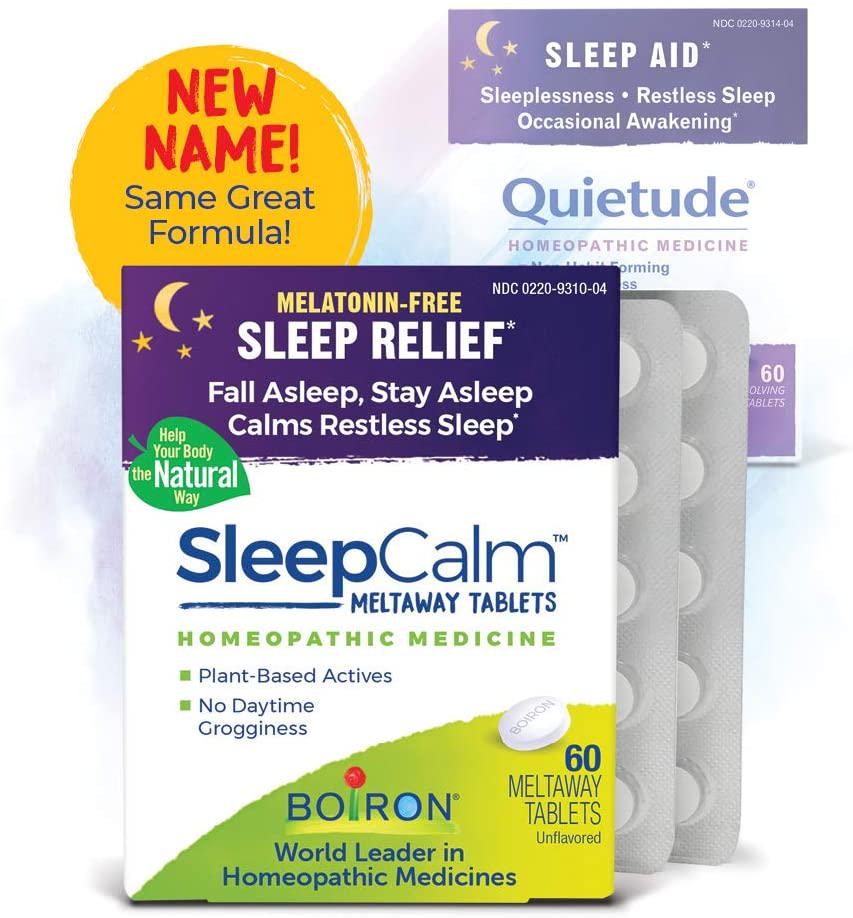 Boiron SleepCalm provides an over-the-counter solution to relieve occasional sleeplessness, restless sleep, and intermittent awakening. This homeopathic medicine calms restless sleep, so you can fall asleep and stay asleep without feeling the next day. It's made with plant-based active ingredients that help restore a natural sleep pattern disturbed by nervousness, exhaustion, an overactive mind, Jet lag, or night shift work. The melt away tablets are convenient to take without water at bedtime, and can be taken on an empty stomach. SleepCalm is of melatonin and other ingredients that cause daytime drowsiness. It's non-habit forming so it won't induce dependence and does not interact with other medications. There are no artificial colors, flavors, sweeteners, or preservatives. for everyone ages 12 and up, sleep calm is available over the counter in a box of 60 or 120 unflavored melt away tablets. Also try Sedalia for daytime symptoms of stress.