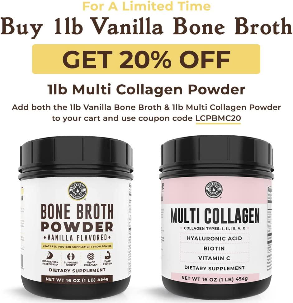 Our premium vanilla bone broth powder is rich in collagen, gelatin, glucosamine, chondroitin and provides 18 grams of healthy protein that will support a healthy gut and joints. It contains no flow agents, fillers or thickening agents Xanthan or Guar Gum which all adds up to a gut-healing, healthy protein powder.