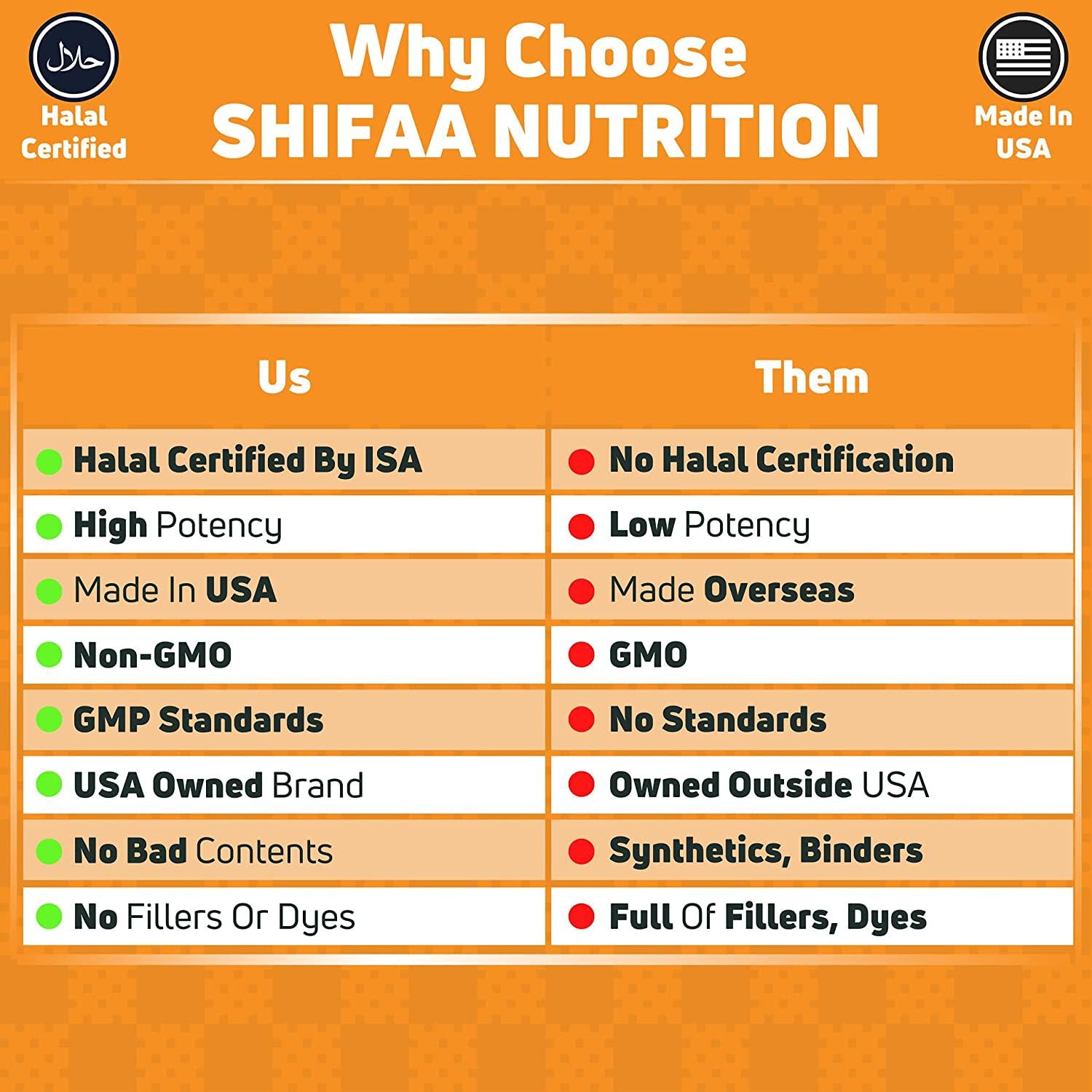 - QUALITY: Our product is proudly MADE IN THE USA, within an FDA-registered facility under strict GMP guidelines, HALAL Certified by ISA. SHIFAA NUTRITION is a brand you can trust because WE STRIVE FOR QUALITY.