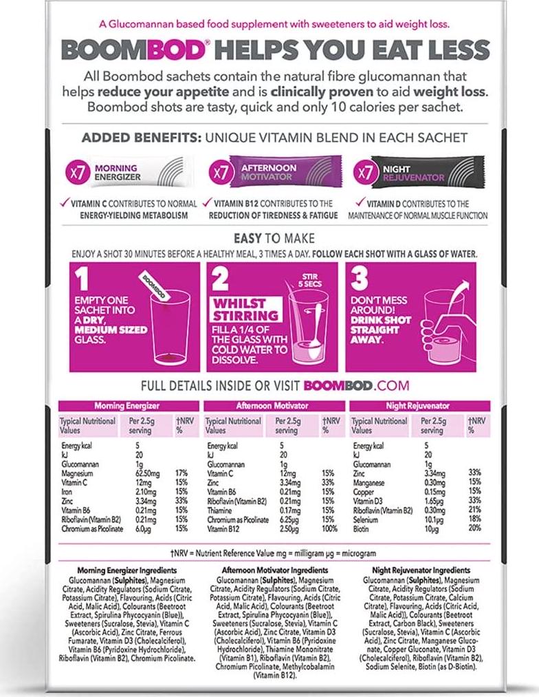 Boombod Weight Loss Shot Drinks are designed to help you feel great and stay on track. These dietary supplements are only 10 calories per shot, and help you lose weight while giving a much needed boost of energy on a daily basis. Boombod is gluten, dairy, sugar, caffeine, aspartame and laxative free. Simply mix the sachets with water to make tasty 10 calorie shots. Remember to keep hydrated and drink plenty of water when taking this supplement. This supplement should be consumed as part of a healthy, balanced diet. Legal Disclaimer These statements have not been evaluated by the Food and Drug Administration. This product is not intended to diagnose, treat, cure, or prevent any disease. Results may vary for Boombod. Glucomannan contributes to weight loss when used with an energy restricted diet. This beneficial effect is obtained with a daily intake of 3g of Glucomannan in 3 doses of 1g each together with 1-2 glasses of water before meals. Glucomannan is the only active ingredient that has been recognised by the European Food Safety Authority (EFSA) in relation to weight loss. Statements regarding dietary supplements have not been evaluated by the FDA and are not intended to diagnose, treat, cure, or prevent any disease or health condition.
