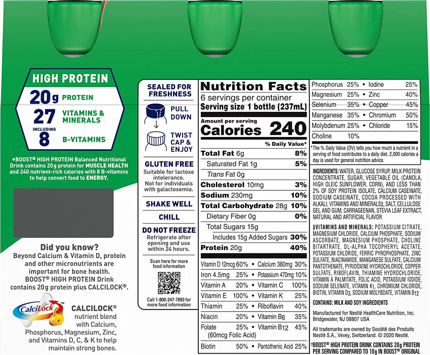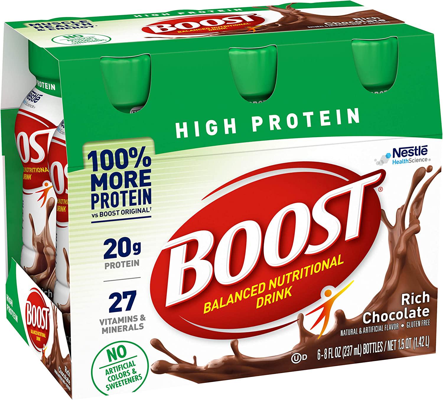 - BOOST HIGH PROTEIN NUTRITIONAL DRINK: Balanced nutritional drink to help you be your best! Enjoy the complete and balanced nutrition of Boost High Protein drink as part of your daily diet. Boost High Protein Nutritional Drinks are gluten free & contain no artificial colors or sweeteners.