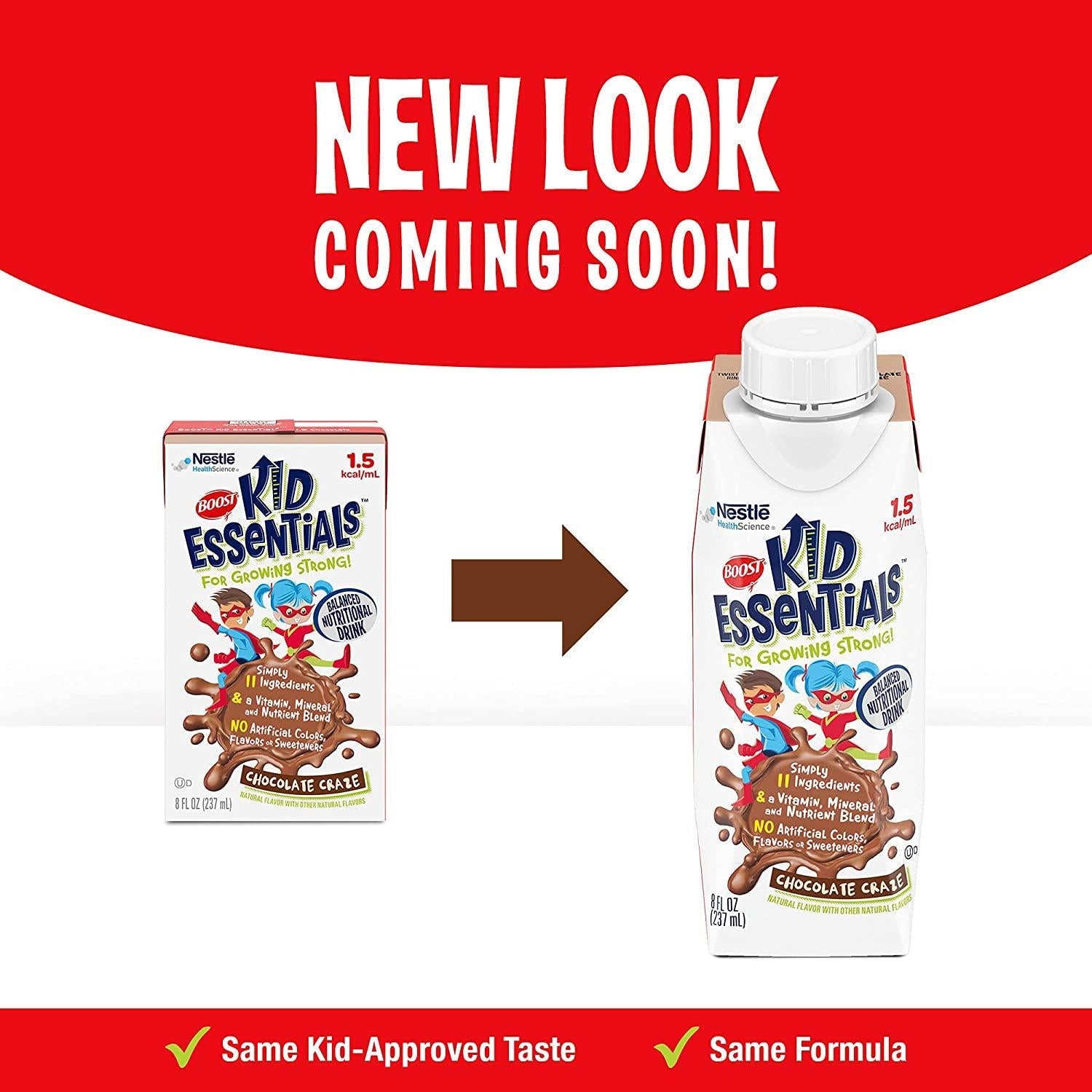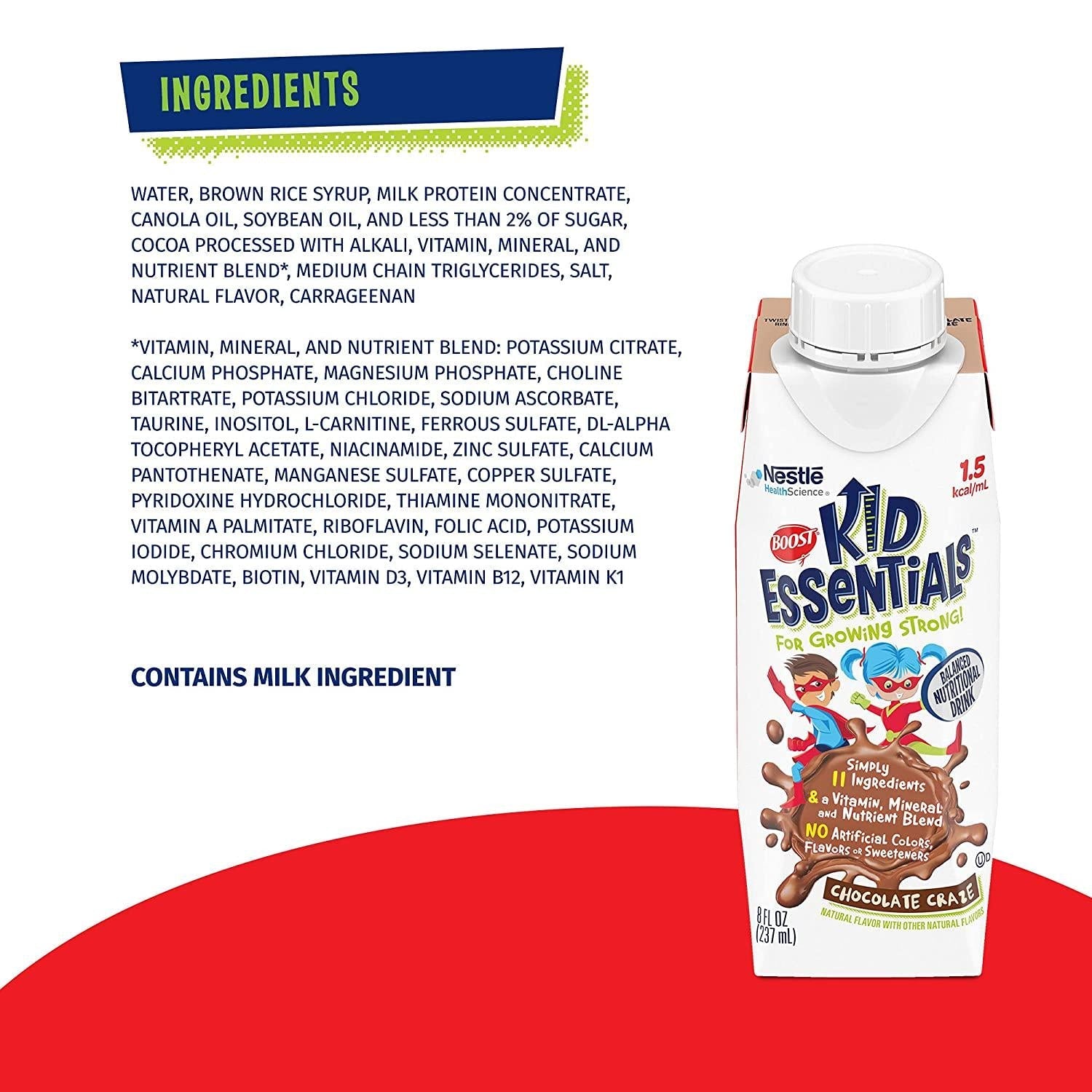 Boost kid Essentials 1.5 nutritionally complete drink is a nutritionally complete pediatric drink delivers more calories in less volume than a standard 1.0 calorie drink. Available in Chocolate craze & Vanilla Vortex flavors.