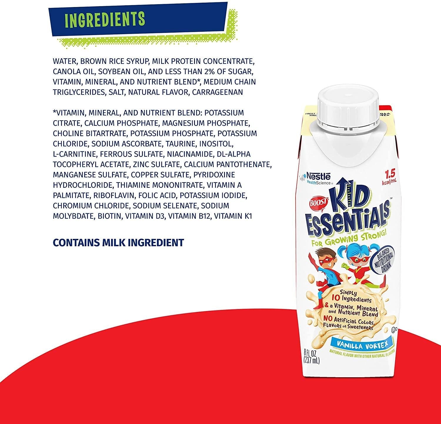 - Specialized nutrition to help kids grow strong: our specially formulated 1.5 kcal/ml balanced nutritional drink provides essential nutrients to help kids grow strong with more calories than our Boost kid essentials 1.0 formula