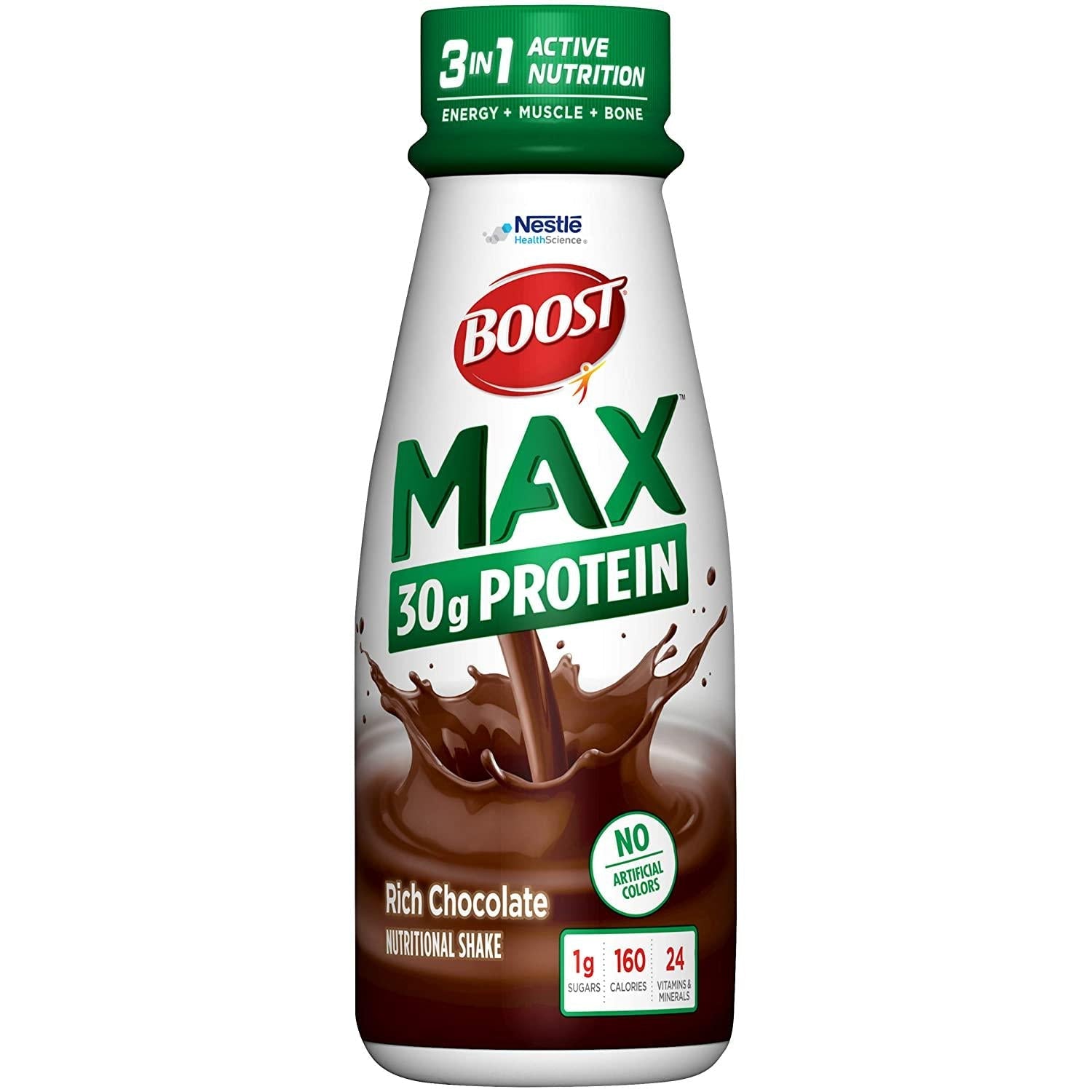 Fuel your body and power all the activities you love with Boost Max Protein Drink. Its 30 grams of high-quality protein are the most per serving of any BOOST Drink. And because its a complete nutrition drink, youll get 24 vitamins and minerals and 160 calories for energy your body needs and everyday peak performance.BOOST Original Complete Nutritional Drink, Rich Chocolate, 8 Ounce Bottle (Pack of 24)