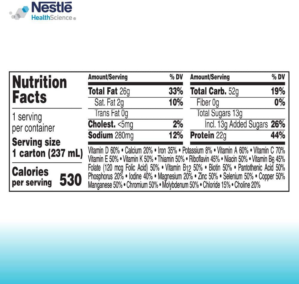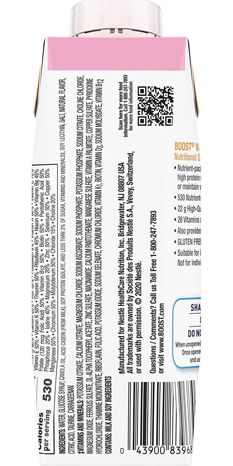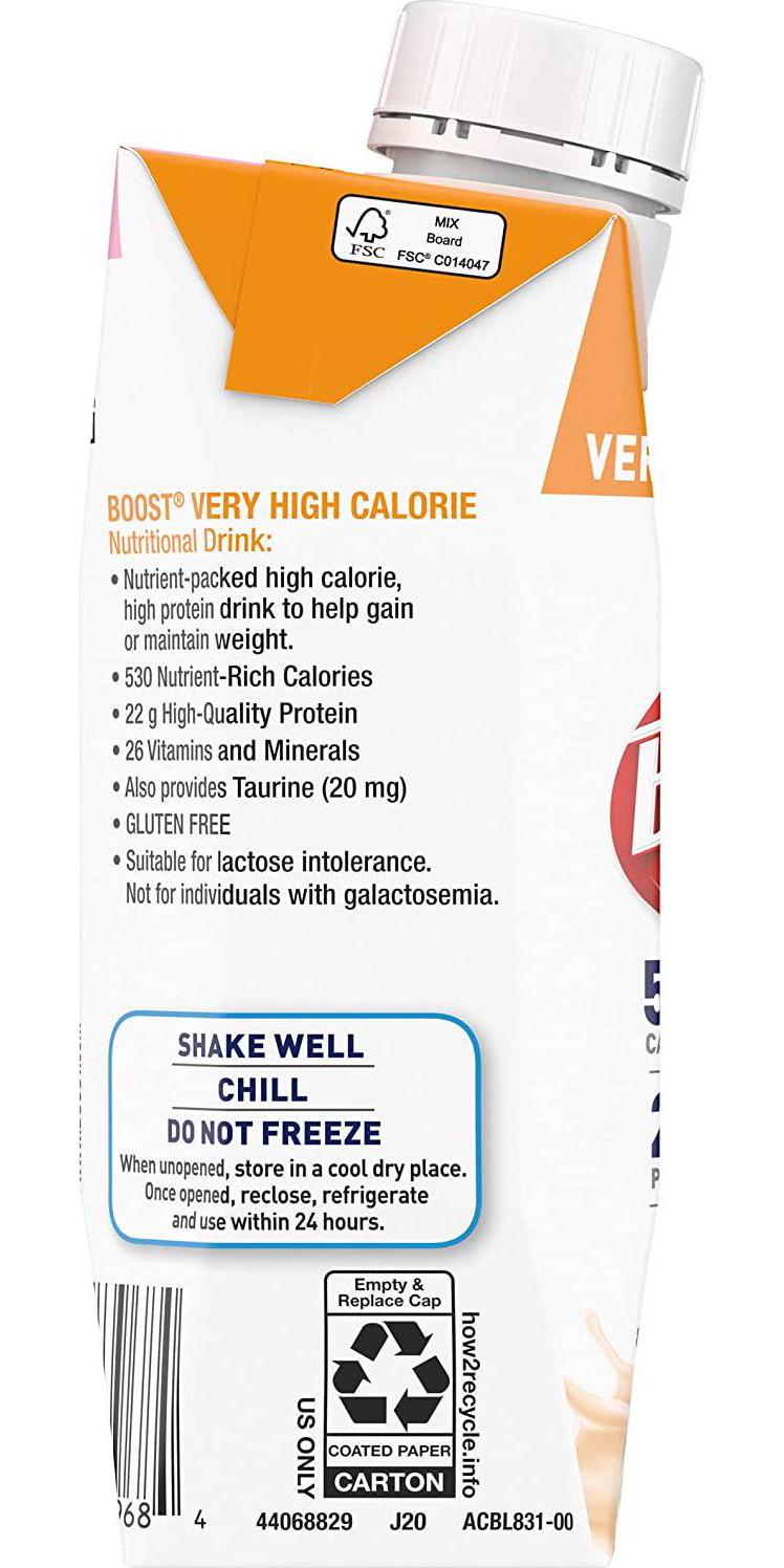 Boost Very High Calorie complete nutritional drink that provides 530 calories per 8 fl oz serving, 22 grams of protein, and 26 vitamins and minerals. Appropriate for fluid-restricted diets and increased calorie and protein needs. The most calorically dense nutritionally complete oral beverage - 2.25 kcal/ml. Nutritionally dense to accommodate diminished appetites. Combines high calories with high protein to help preserve lean muscle mass and support weight goals. Appropriate for fluid-restricted diets and increased calorie and protein needs. Best if served chilled.