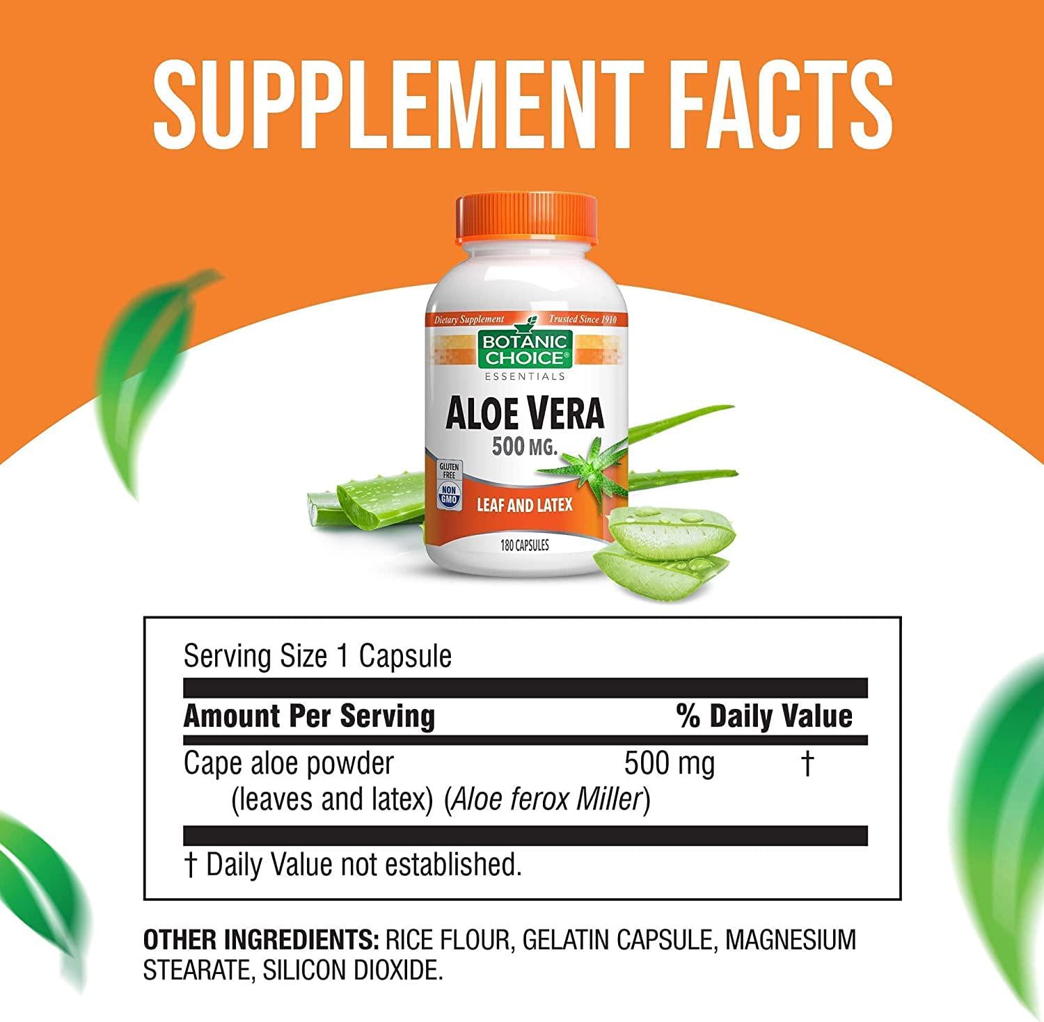 180 capsules, 500mg, aloe vera capsules, botanic choice, digestive health, usa