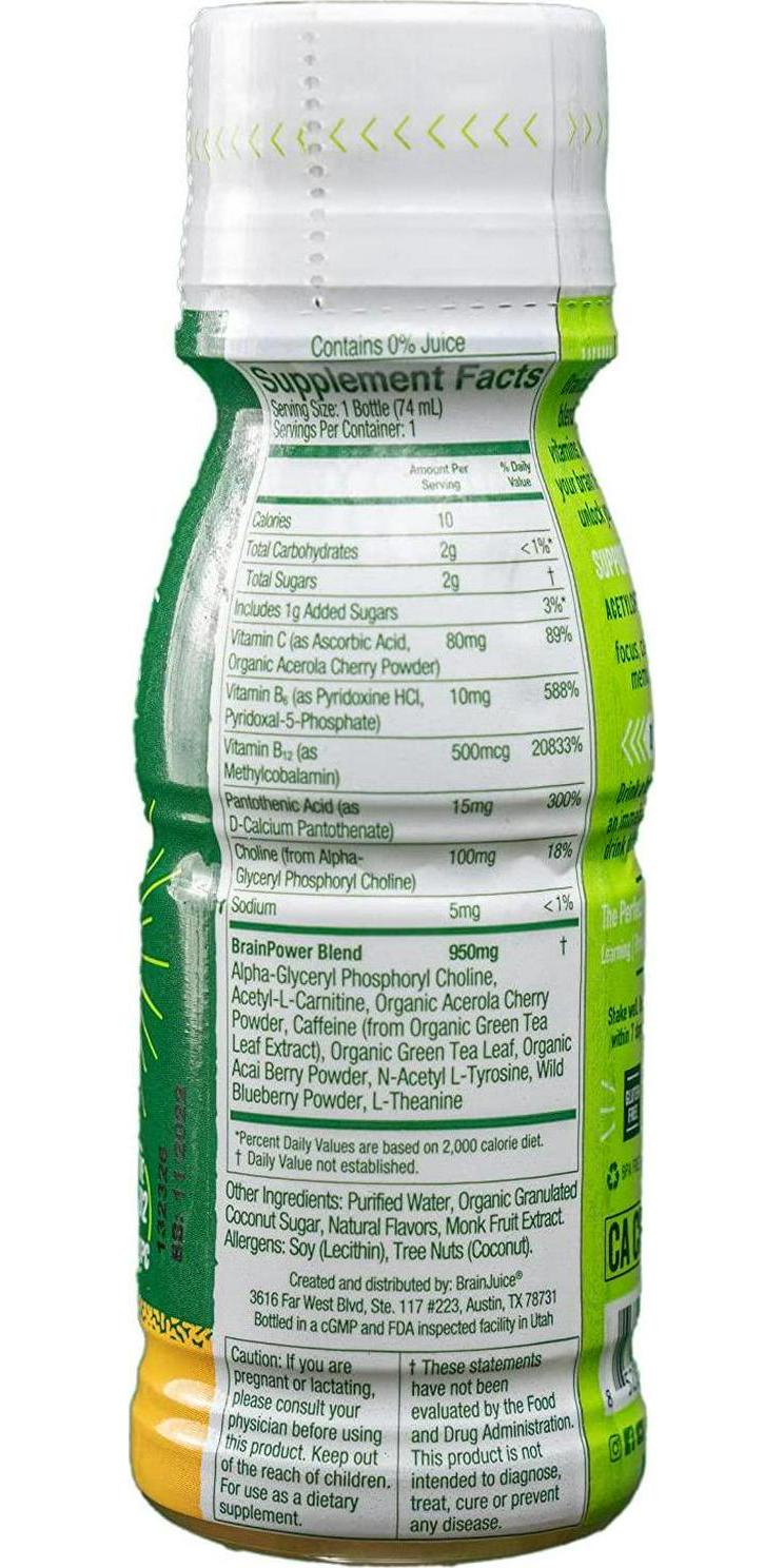 - Contains 12 - 2.5 fl oz BrainJuice Liquid Shots, Original Peach Mango