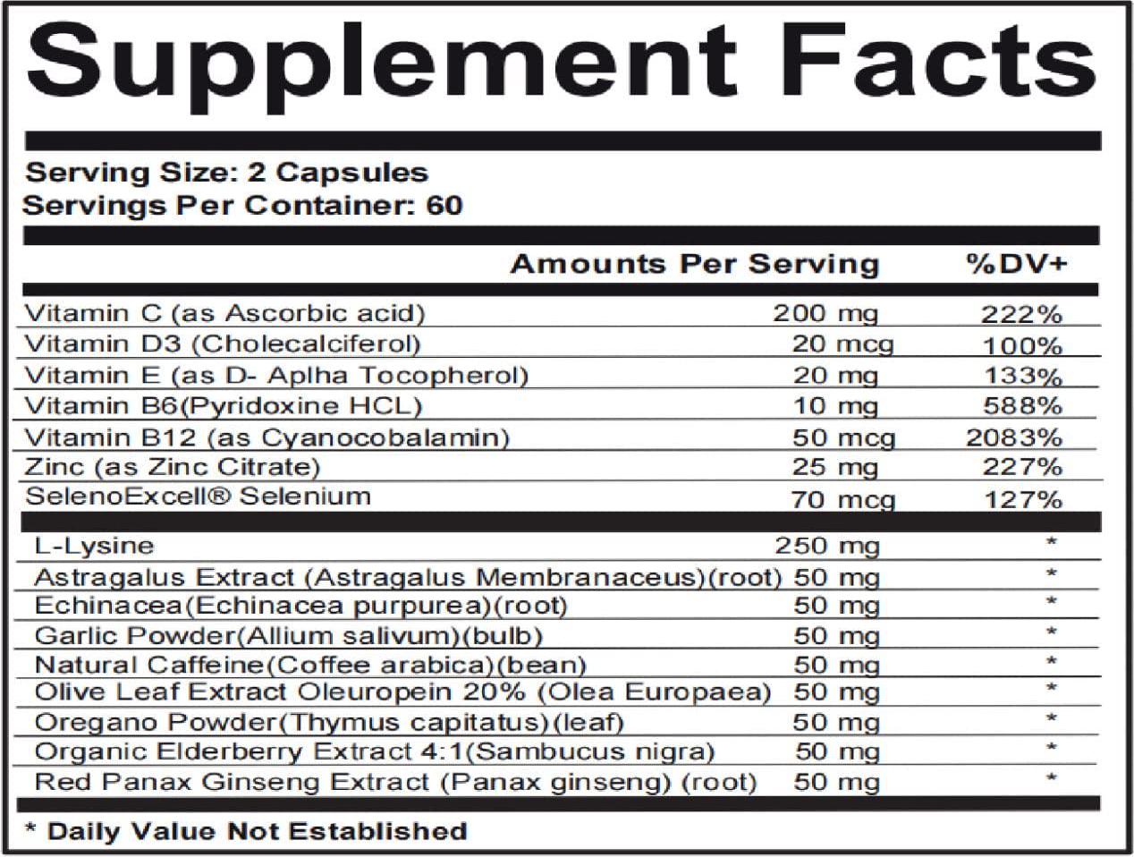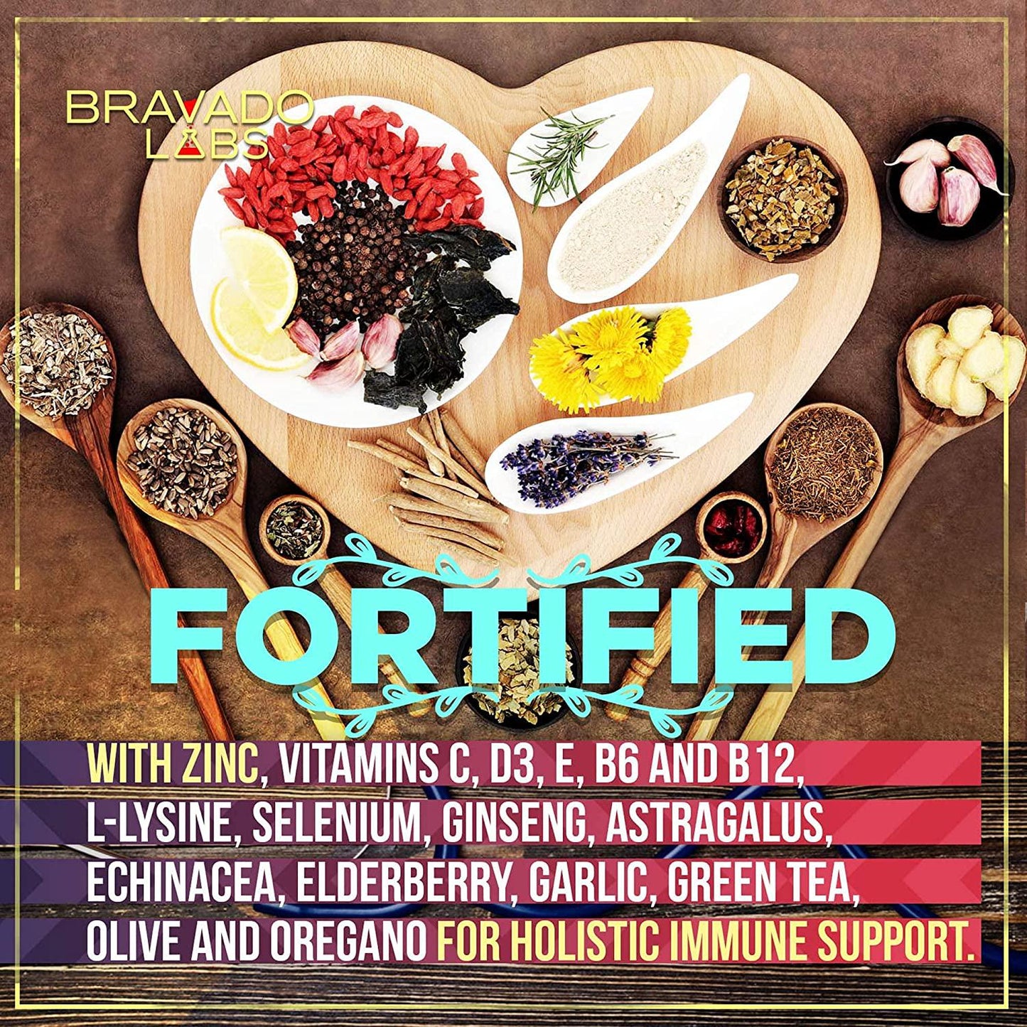 - FORTIFIED with Zinc, Vitamins C, D3, E, B6 and B12, L-Lysine, Selenium, Ginseng, Astragalus, Echinacea, Elderberry, Garlic, Green Tea, Olive and Oregano for holistic immune support.