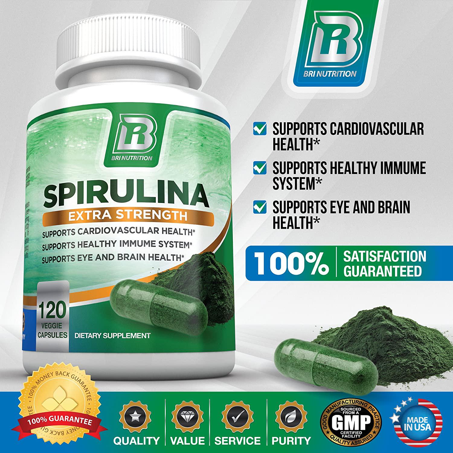 BRI Spirulina 2000mg Maximum Strength Premium Quality Spirulina Superfood Powder, Packed w Antioxidants, Protein and Vitamins in Easy to Swallow Vegetable Cellulose Capsules (120 Count)