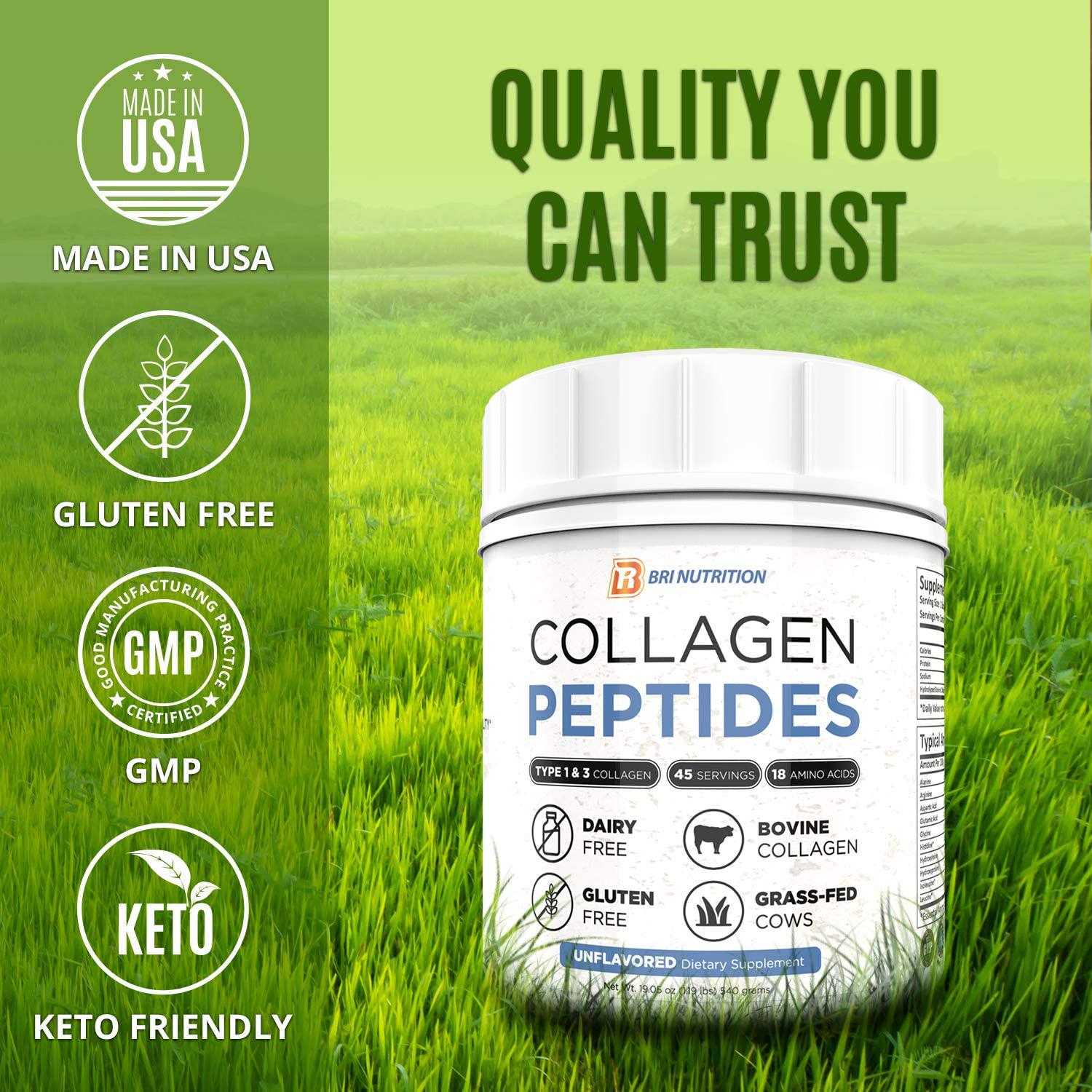 BRI Unflavored Collagen Powder - Hydrolyzed so It's Easy to Mix and Swallow | Collagen Peptides Boost Hair, Nails, Skin and Joints | Non-GMO, Keto Friendly, Grass-Fed and Gluten Free | 45 Servings