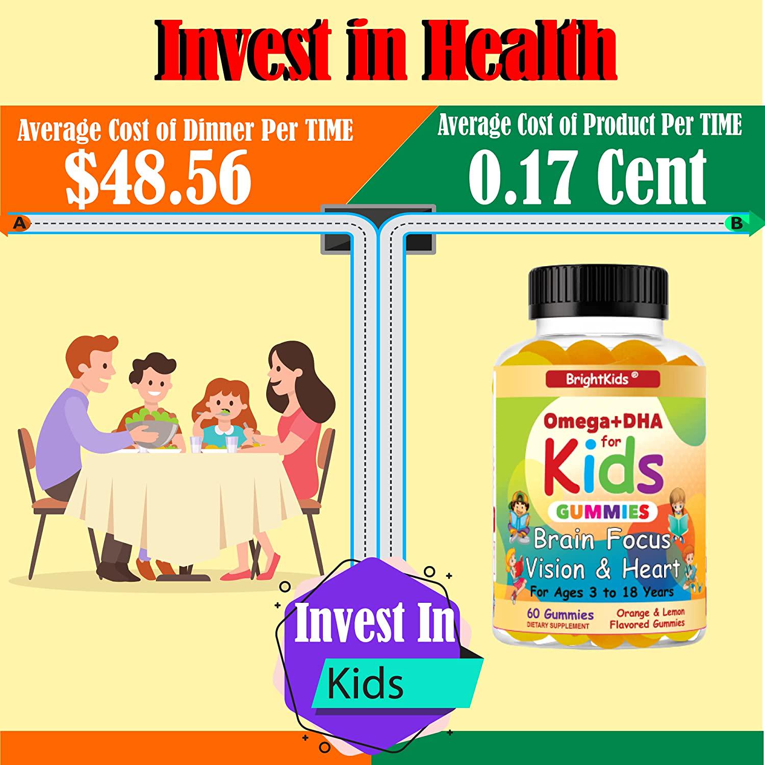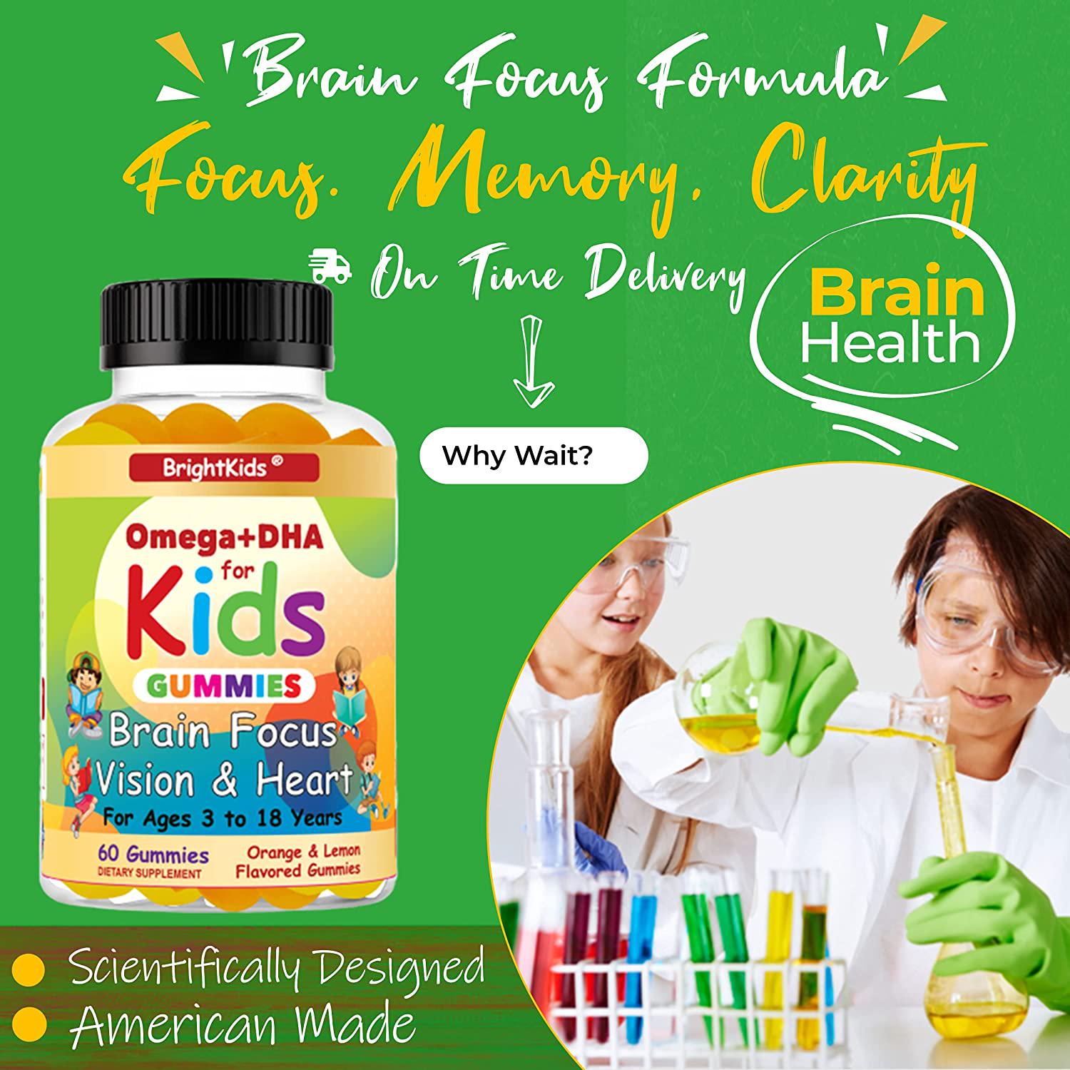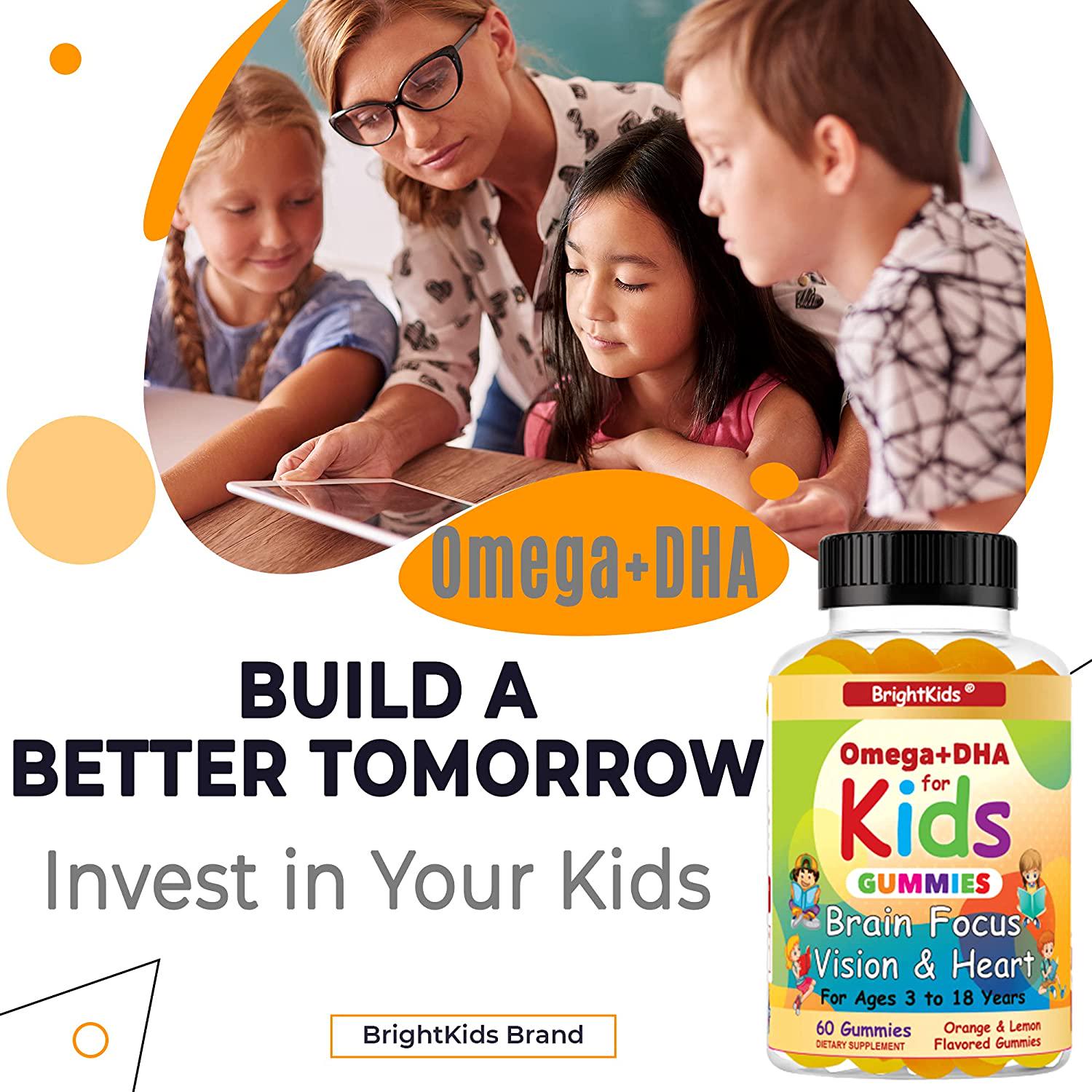 BrightKids Complete Omega+DHA Gummies for Kids | Omega 3 6 9 + DHA, Vitamin C | Brain Focus, Vision and Heart Health Formula | Gluten Free, Vegetarian and Non-GMO | 60 Gummies Made in USA