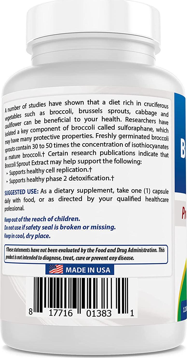 Best Naturals Broccoli Sprout Extract is a high-quality broccoli (Brassica oleracea) sprout extract, standardized to 6% glucosinolates and 0.3% sulforaphane, the active constituents found in cruciferous vegetables.