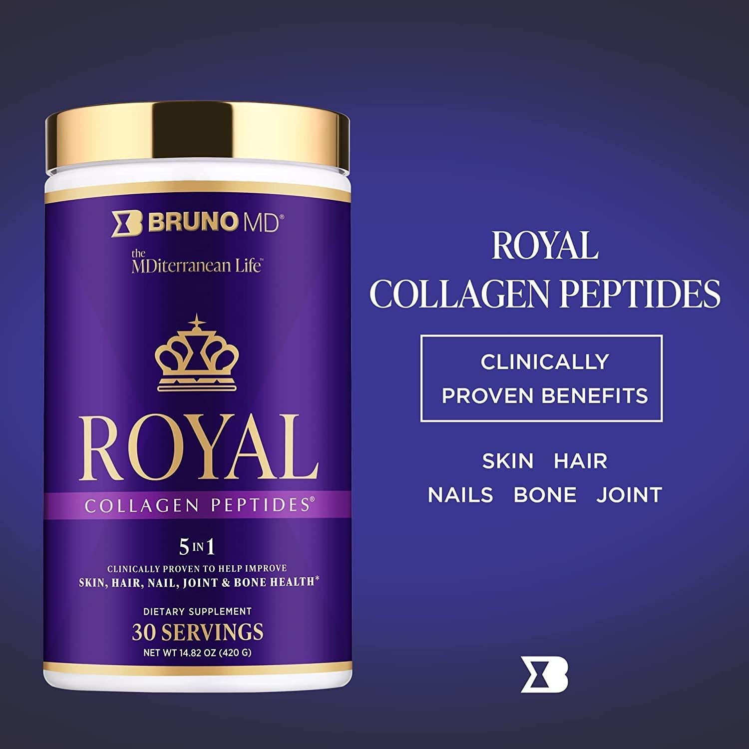 Bruno MD Royal Collagen Peptides, Clinically proven, Dietary Supplement, Improves Skin, European Sourced, Improves the Look of Hair and Nails, Blended with Vitamin C, Natural Bone and Joint Supplement