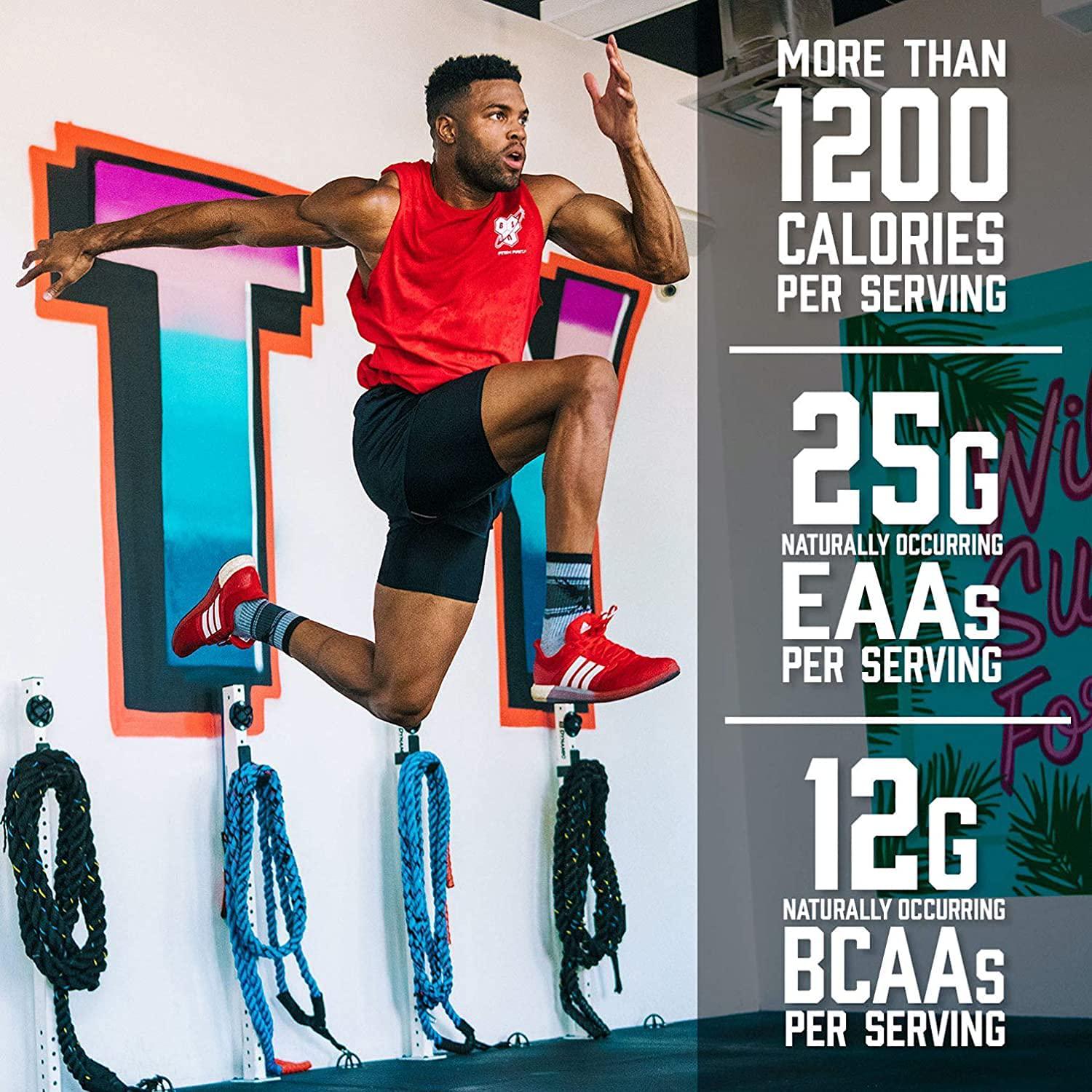 - 215 grams of carbohydrates per serving, primarily rolled oats. BCAAs and other essential and non-essential amino acids