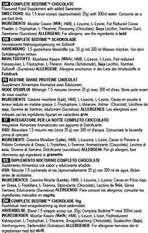 BULK POWDERS Complete Bedtime is a Micellar Casein based, night-time protein shake, providing an impressive 30g of protein per serving along with a range of other key nutrients and amino acids. Un Whey, Micellar Casein is a source of slow-digesting protein, contributing to the growth and maintenance of muscle mass. This makes Complete Bedtime the perfect supplement for those looking to lead and active and healthy lifestlye. In addition, Complete Bedtime contains Leucine and HMB an extremely popular supplement duo for heavy training individuals. Theanine, a natural constitute of tea; as well as Lysine, an essential amino acid found in foods such as beans, cheese and yoghurt; have also been added to round off this impressive formula. Low in fat and carbohydrates, Complete Bedtime is available in range of delicious flavours.
