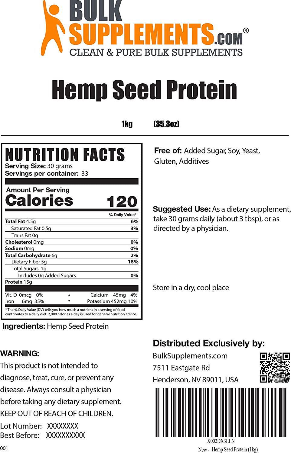BulkSupplements.com Hemp Seed Protein - Vegan Protein Powder - Unsweetened Protein Powder - High Fiber Protein Powder (1 Kilogram - 2.2 lbs)