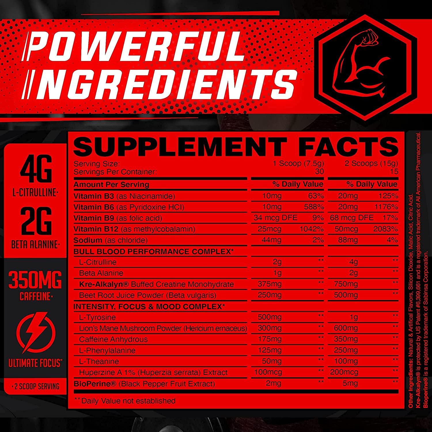 Bull Blood Ultimate Energy Boost - Extra Strength Energy, Focus, Blood Flow and Muscle Growth with Nitric Oxide, Creatine, Lion's Mane, Effective Pre Workout and Nitric Oxide Booster for Men and Women