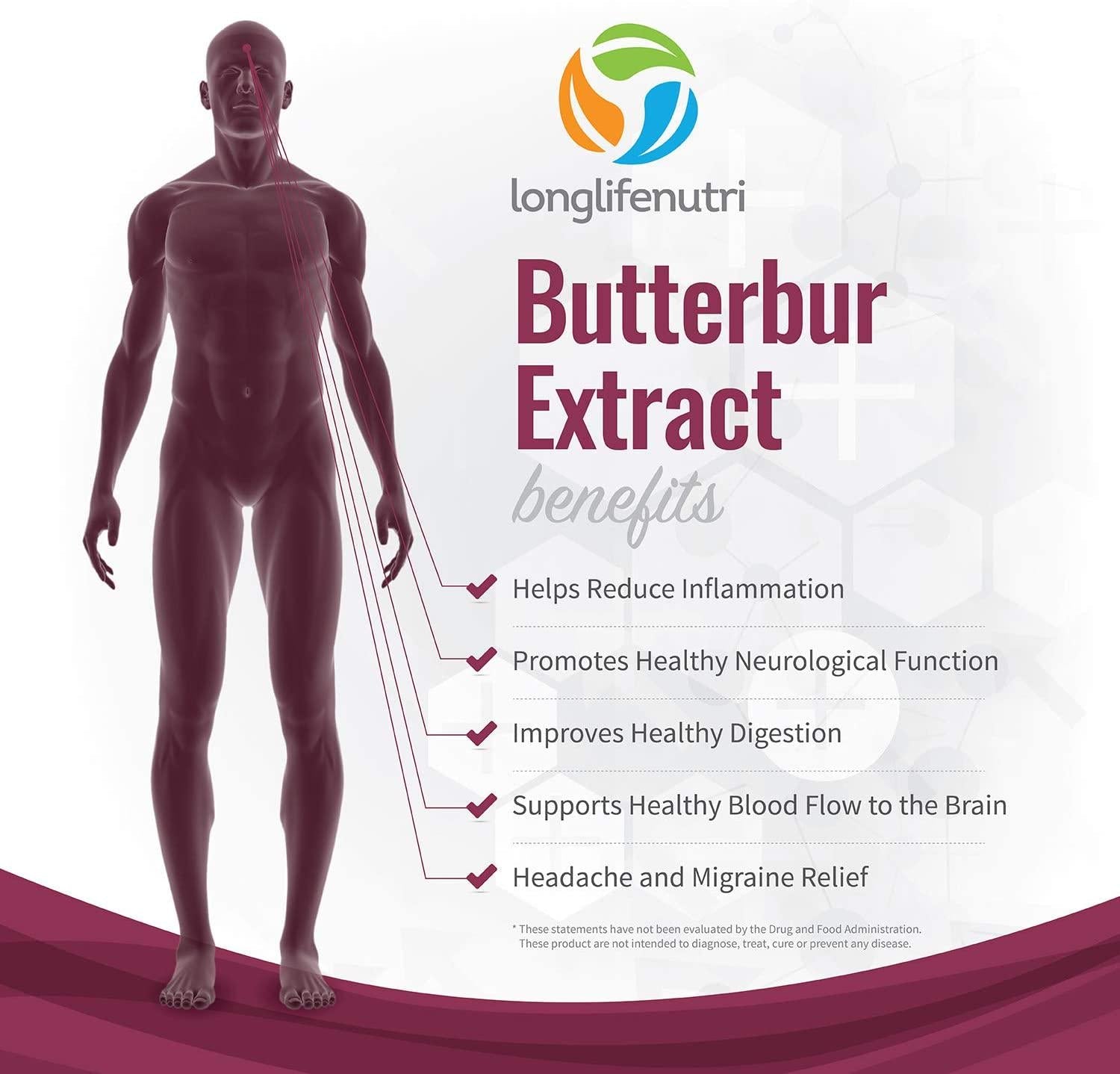 - PREMIUM QUALITY, POTENCY AND PURE BUTTERBUR NON-GMO & GLUTEN FREE - LLN Butterburr has high potency levels and has been shown to be a fantastic daily optimizer of migraine, headache and fever few prevention for men and women. Our product pass through researches to verify procedure for you get the safest and purest product. MADE IN USA. Our products are made according to strict GMP USP USDA standards.