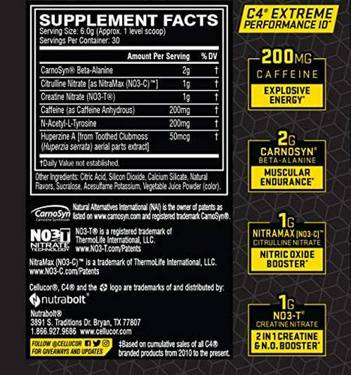 Evolved: Innovative ingredients. Enhanced formulas.These core principles are the backbone of Project Clear Evolution. We're swapping artificial colors and flavors in favor of more naturally-derived options, peeling back prop blends to showcase all the performance ingredients that make our products tick, and boosting our formulas with enhanced inputs for extreme performance. This is the future of sports nutrition, and it starts with the all-new C4 Extreme.FEATURING NITRAMAX (NO3-C).Created by bonding citrulline with patented nitrates, NitraMax (NO3-C) is an advanced compound that delivers dual-pathway nitric oxide (NO) support. Un citrulline or citrulline malate, which work through a single mechanism, NitraMax supports two mechanisms of NO creation, the arginine pathway (eNOS) and the nitrate-nitrite conversion system, to help promote the ultimate pump.REINVENTING A LEGEND.Over two years in the making, spanning multiple formula tweaks and hundreds of flavor tests, C4 Extreme has been reengineered and reimagined from the ground up to help support explosive energy, extreme performance, powerful pumps, and mental alertness. This is the product that defined a category, now evolved and updated.Building on the legendary C4 performance formula, C4 Extreme is formulated with the following patented and clinically studied ingredients in to fuel your most extreme training sessions:Nitramax Citrulline Nitrate (NO3-C) -- 1g
