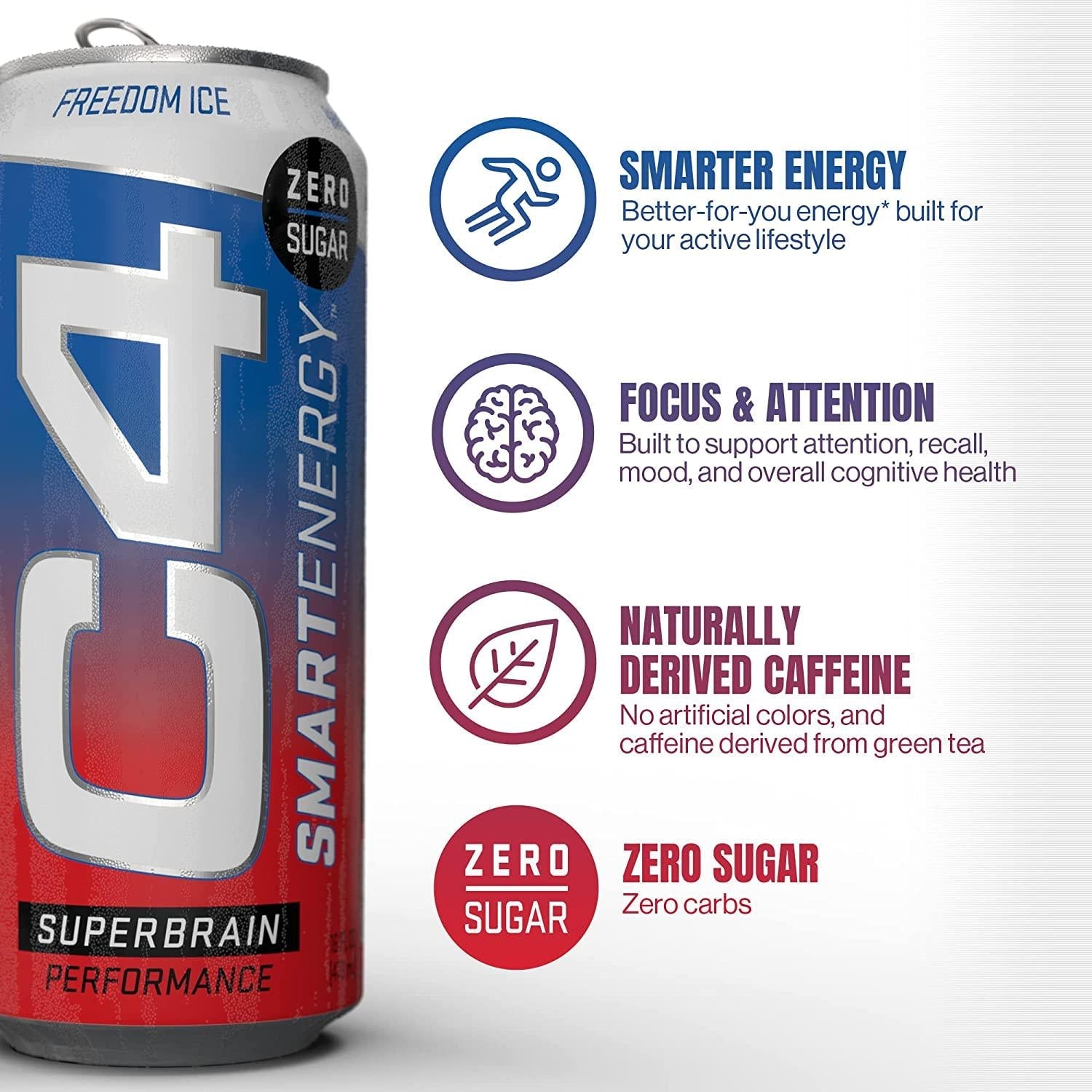 C4 Smart Energy Drink - Sugar Free Performance Fuel and Nootropic Brain Booster, Coffee Substitute or Alternative | Freedom Ice 12 Oz - 12 Pack