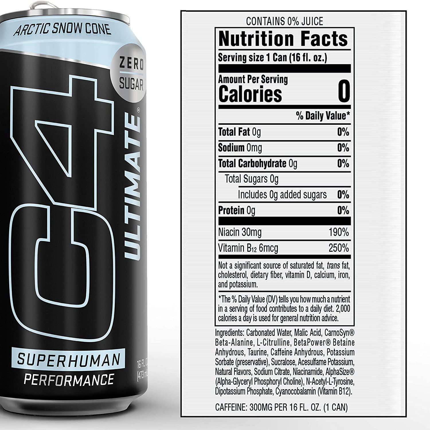 C4 Ultimate Sugar Free Energy Drink 16oz (Pack of 12) | Arctic Snow Cone | Pre Workout Performance Drink with No Artificial Colors or Dyes