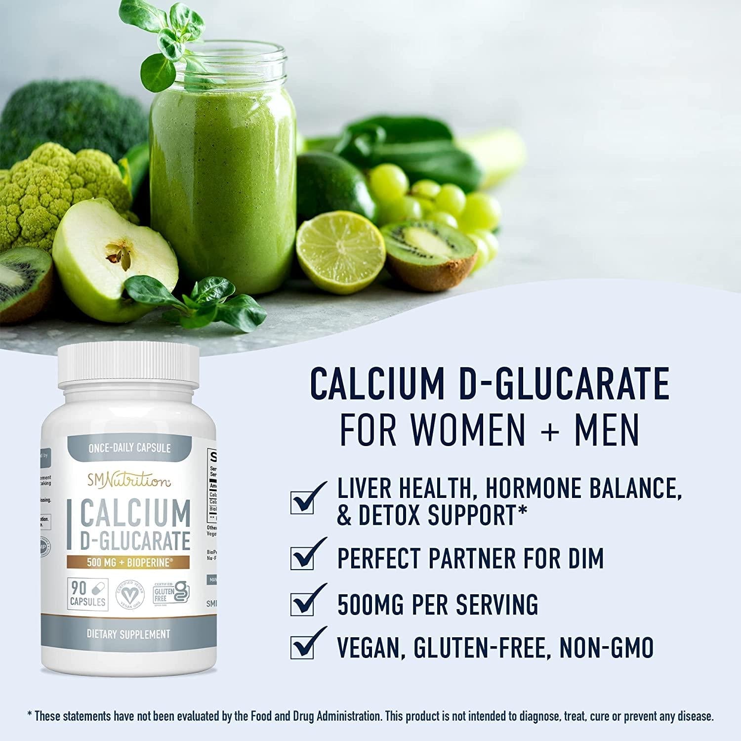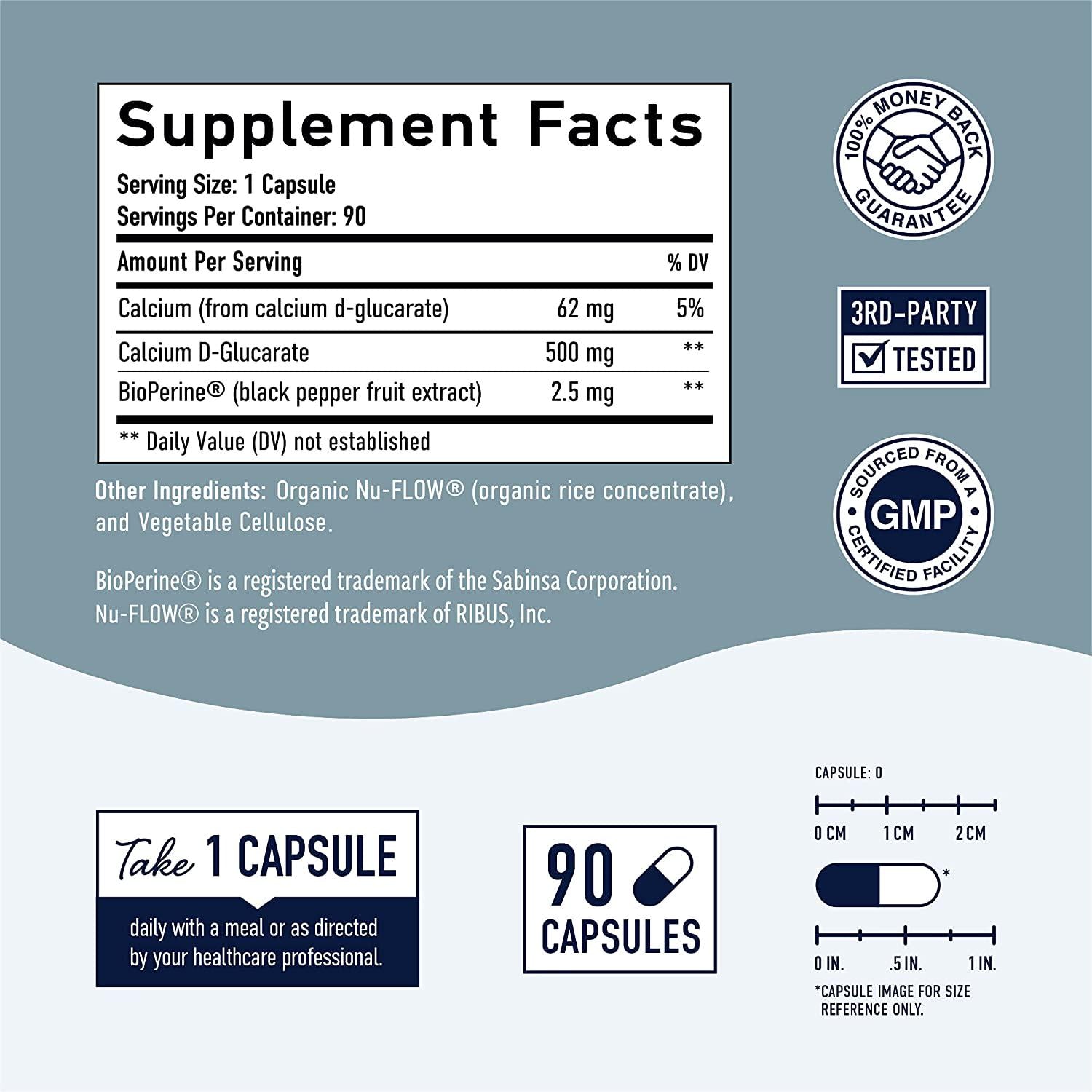 - OUR DIFFERENCE: Calcium D-Glucarate by SMNutrition is Third-Party Tested by Intertek Laboratories in 2021, Non-GMO, Gluten Intolerance Group Certified, Vegan, HALAL Certified, PETA.org Certified, Titanium Dioxide-Free, Silicon Dioxide-Free, and formulated without the top 8 allergens. It is manufactured in a facility that is certified GMP compliant with NSF standards.