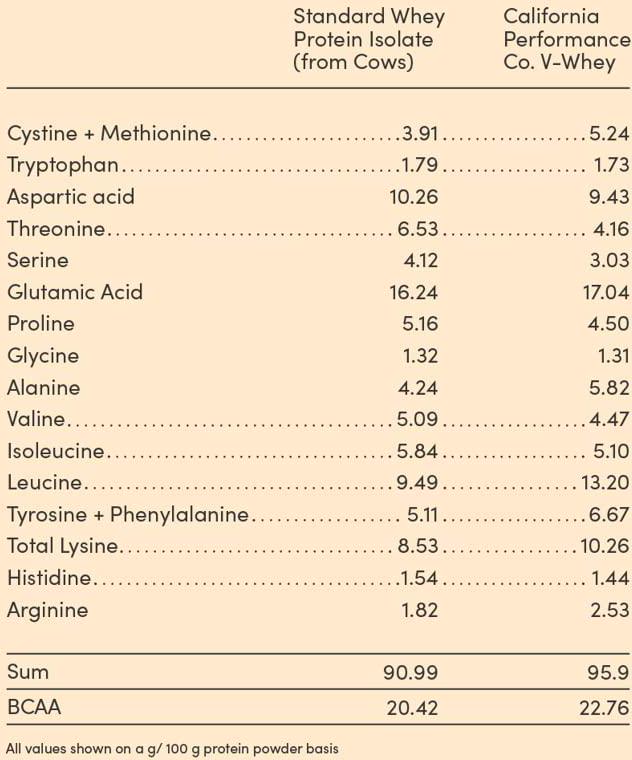 - V-Whey s animal-free whey protein ingredient is bioidentical to whey protein from cows. In addition to having up to 23g of complete protein per serving, V-Whey has up to 5g of naturally-occurring BCAAs (3 essential amino acids that help support protein synthesis) per serving.