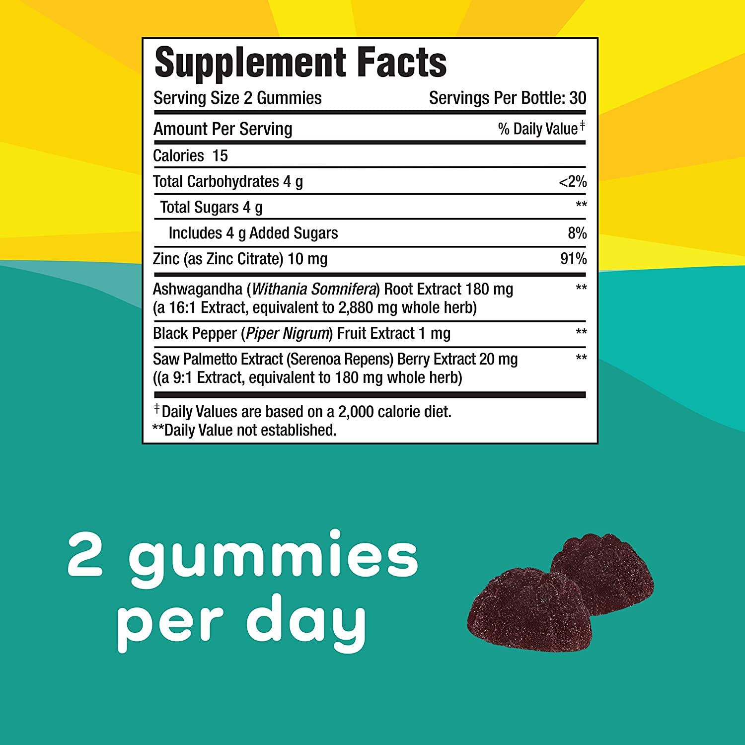 - POWERFUL RESEARCHED INGREDIENTS FOR STRESS RELIEF: These gummies are formulated with 10mg zinc, 2880mg ashwagandha root extract, 1mg black pepper fruit extract, and 180mg saw palmetto berry extract.