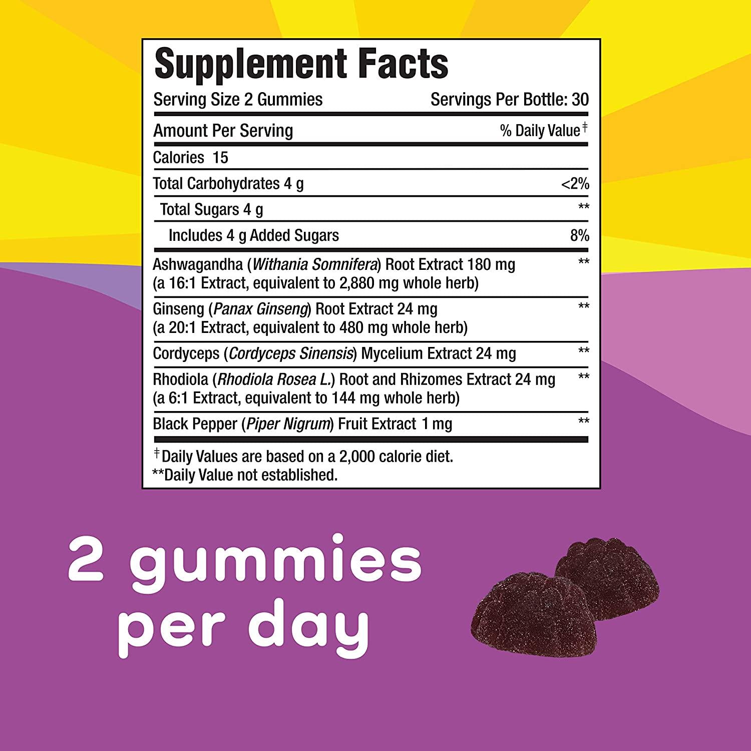 - POWERFUL RESEARCHED INGREDIENTS FOR STRESS RELIEF: These gummies are formulated with 2880mg ashwagandha root extract, 480mg ginseng root extract, 24mg cordyceps mycelium extract, 144mg rhodiola root and rhizomes extract, and 1mg black pepper fruit extract.