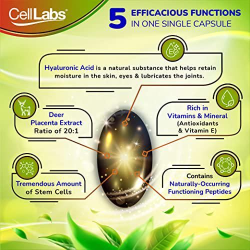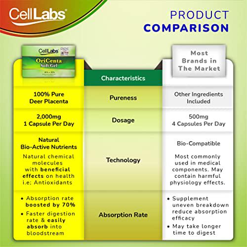 CellLabs OriCenta 100% Natural 2000mg Pure New Zealand Deer Placenta 60 Softgels| Active Stem Cell Rich In Nutrients, Minerals, Vitamins, Antioxidant|Support Healthy Energy Level, Slow Down Skin Aging Clinically Proven Anti-Aging Result With 100% New Zealand Deer Placenta! OriCenta Deer Placenta rich with active nutritional ingredients that come from the finest New Zealand Deer which contain a high amount of freshly extracted 2,000mg deer placenta per capsule, which helps to slow down the aging progress by speed up the healing process, improve cellular growth & restore youthful and vitality. Deer Placenta is known as a premium source of supplement as it's biologically compatible with humans & safe for consumption. Using live-cell therapy with deer placenta extract could allow damaged cells repaired. It also contains abundant levels of antioxidants & nourishment to keep you healthy.