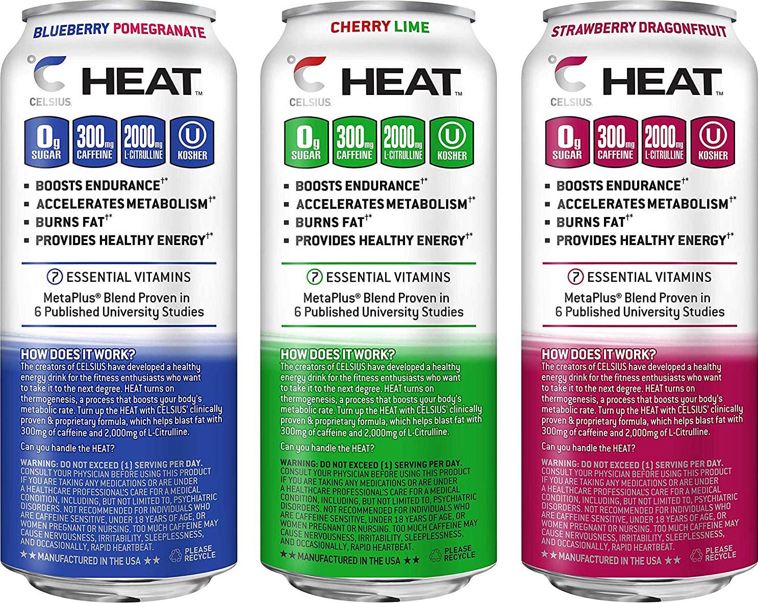 Your Ultimate Training Partner! CELSIUS HEAT is a thermogenic pre-workout drink that's designed to give your body an additional boost during a workout. It provides long-lasting healthy energy without the crash or jitters. As the trainer's grade version of CELSIUS' proprietary MetaPlus formula, this carbonated pre-workout drink delivers the same great benefits as CELSIUS with an added blend of 300mg. of caffeine and 2,000mg. of L-Citrulline (an amino acid) to quickly deliver nutrients throughout your system when you need it most. Why Choose CELSIUS HEAT Un other pre-workout drinks, CELSIUS HEAT uses a proprietary MetaPlus formula with green tea, EGCG, guarana seed extract, and ginger root extract to help deliver performance-worthy energy. CELSIUS HEAT also contains biotin, pantothenic acid, taurine, glucuronolactone, calcium, riboflavin, niacin, and vitamins C, B6, and B12. It contains no sugar, no high fructose corn syrup, no aspartame, no preservatives, no artificial colors or flavors, and no sodium. CELSIUS HEAT's formula is also gluten free, soy free, Kosher, and Vegan. CELSIUS HEAT Performance Energy Drink is carbonated and has the perfect balance of delicious flavor and healthy energy that serves as an awesome tool for stimulating intense workouts. Disclaimer: CELSIUS HEAT alone does not produce weight loss in the absence of a healthy diet and moderate exercise. Make CELSIUS HEAT part of your daily regimen. *These statements have not been evaluated by the Food and Drug Administration. This product is not intended to diagnose, treat, cure or prevent any disease. WARNING: CONSULT YOUR PHYSICIAN BEFORE USING THIS PRODUCT IF YOU ARE TAKING ANY MEDICATIONS OR ARE UNDER A HEALTHCARE PROFESSIONAL'S CARE FOR A MEDICAL CONDITION, INCLUDING, BUT NOT LIMITED TO, PSYCHIATRIC DISORDERS. NOT RECOMMENDED FOR INDIVIDUALS WHO ARE CAFFEINE SENSITIVE, UNDER 18 YEARS OF AGE, OR WOMEN PREGNANT OR NURSING. TOO MUCH CAFFEINE MAY CAUSE NERVOUSNESS, IRRITABILITY, SLEEPLESSNESS, AND OCCASIONALLY, RAPID HEARTBEAT.