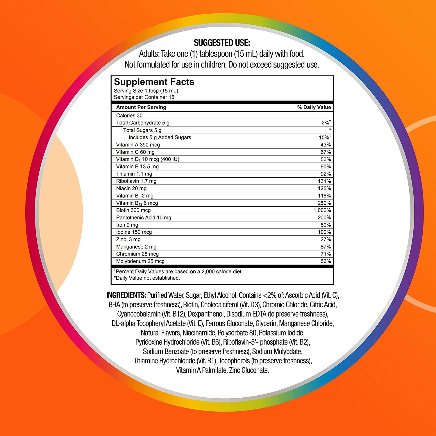 Centrum Liquid Multivitamin for Adults is the perfect multivitamin/multimineral supplement for adults who have difficulty taking tablets. Packed with 17 essential micronutrients, this liquid multivitamin for women and men helps fill nutritional gaps and promotes full body wellness. This immune support supplement contains vitamins C, E, beta-carotene and zinc. These liquid multivitamins for adults also includes iron and B vitamins to deliver the nutrients and energy supplements your body needs to support your daily energy needs, helping you metabolize fats, carbohydrates and proteins effectively. Available in a tangy citrus flavor, these liquid vitamins for adults provide the recommended amount of key nutrients to maintain your overall health. Take one tablespoon daily with food. Feed your cells, fuel your life with Centrum, the #1 doctor and pharmacist recommended brand.