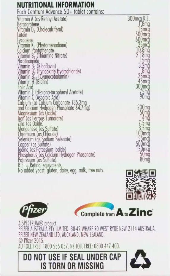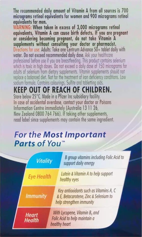 Backed by 30 years of nutritional science research, Centrum Multivitamin and Multimineral 50 Plus Tablets have been specially formulated for adults over 50 years of age. Providing a complete daily Supment of multivitamins and multi-minerals to support changing health needs, the Tbs contain age adjusted levels of key nutrients to help maintain vitality, normal vision and bone health. Comprising 25 key nutrients and 13 essential vitamins, the Tbs also support energy release and immunity with antioxidant vitamin C. - K.N. Cautions: Not suitable for pregnant or breast feeding women. Centrum Advance 50+ should NOT be used as a substitute for a varied diet and a healthy lifestyle. If taking other Supments, please read the label, since they may contain the same ingredients. Product contains iron, which can be harmful to children if taken in large doses.