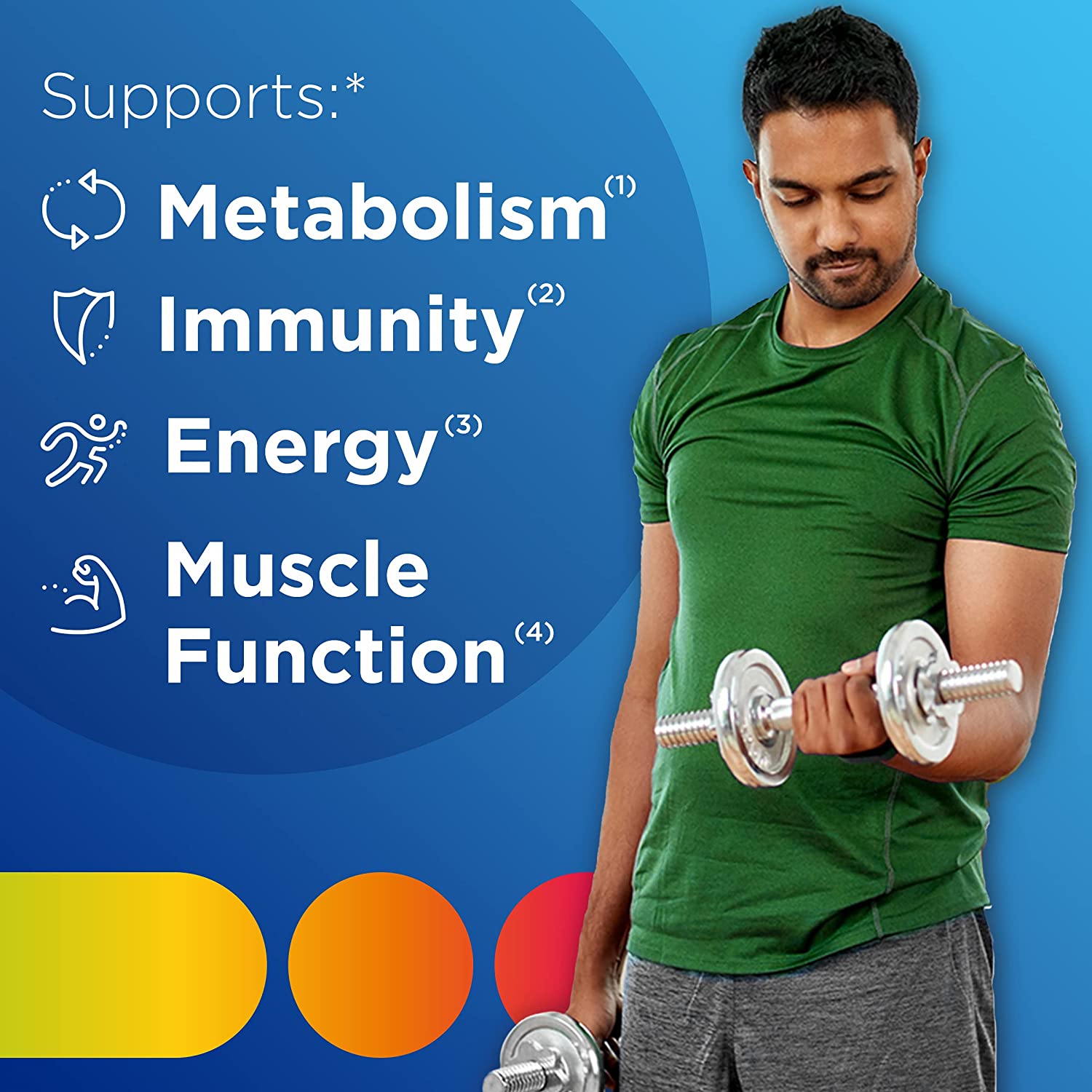 - Men's multivitamin features Vitamins C, E and Beta-Carotene and Zinc to provide immunity support, B Vitamins to support energy levels and metabolism, and Vitamin B6 and Vitamin D to support healthy muscle function (1)